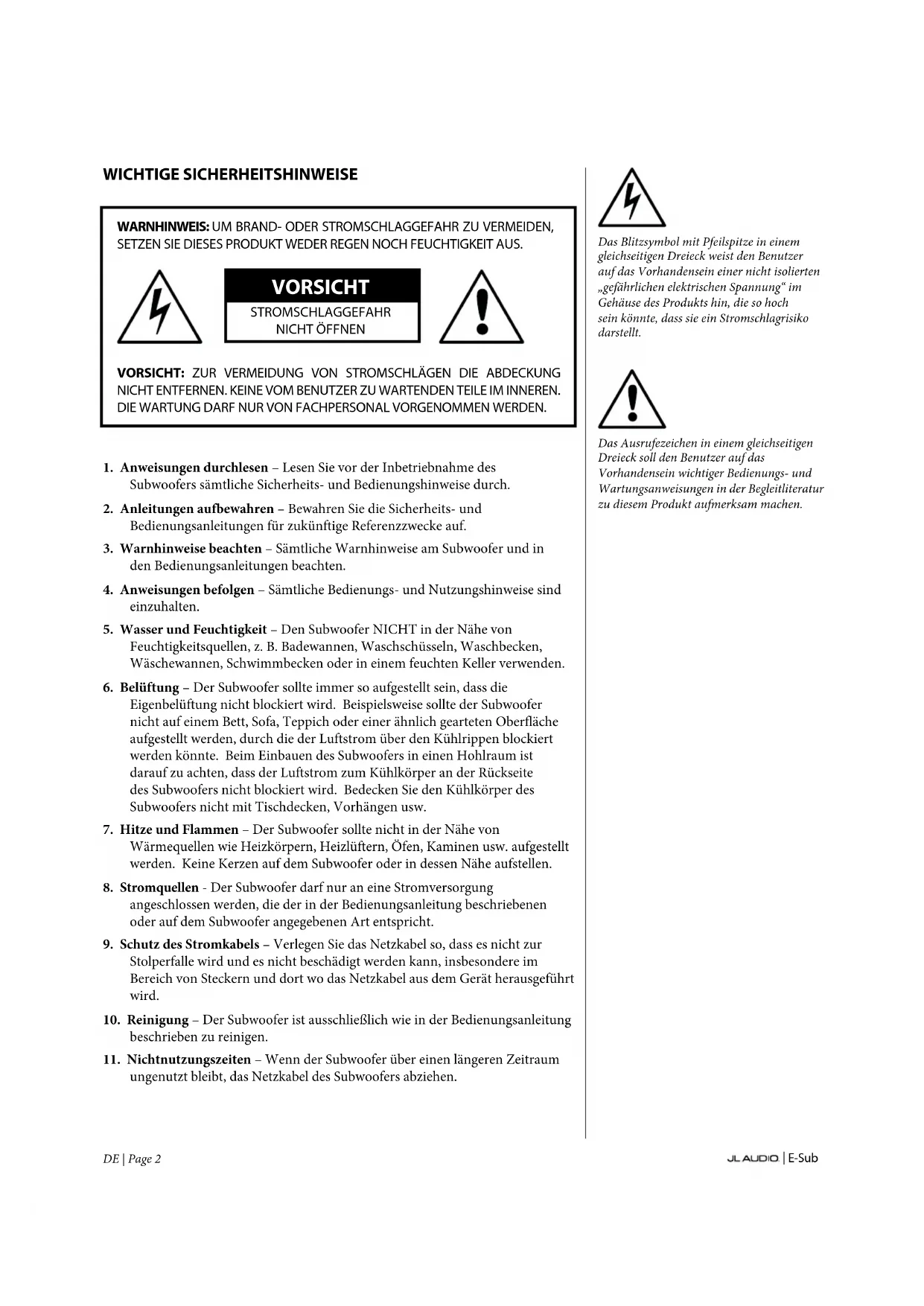 ungenutzt bleibt, das Netzkabel des Subwoofers abziehen. Das Blitzsymbol mit Pfeilspitze in einem gleichseitigen Dreieck weist den Benutzer auf das Vorhandensein einer nicht isolierten „gefährlichen elektrischen Spannung“ im Gehäuse des Produkts hin, die so hoch sein könnte, dass sie ein Stromschlagrisiko darstellt. Das Ausrufezeichen in einem gleichseitigen Dreieck soll den Benutzer auf das Vorhandensein wichtiger Bedienungs- und Wartungsanweisungen in der Begleitliteratur zu diesem Produkt aufmerksam machen.| E-Sub