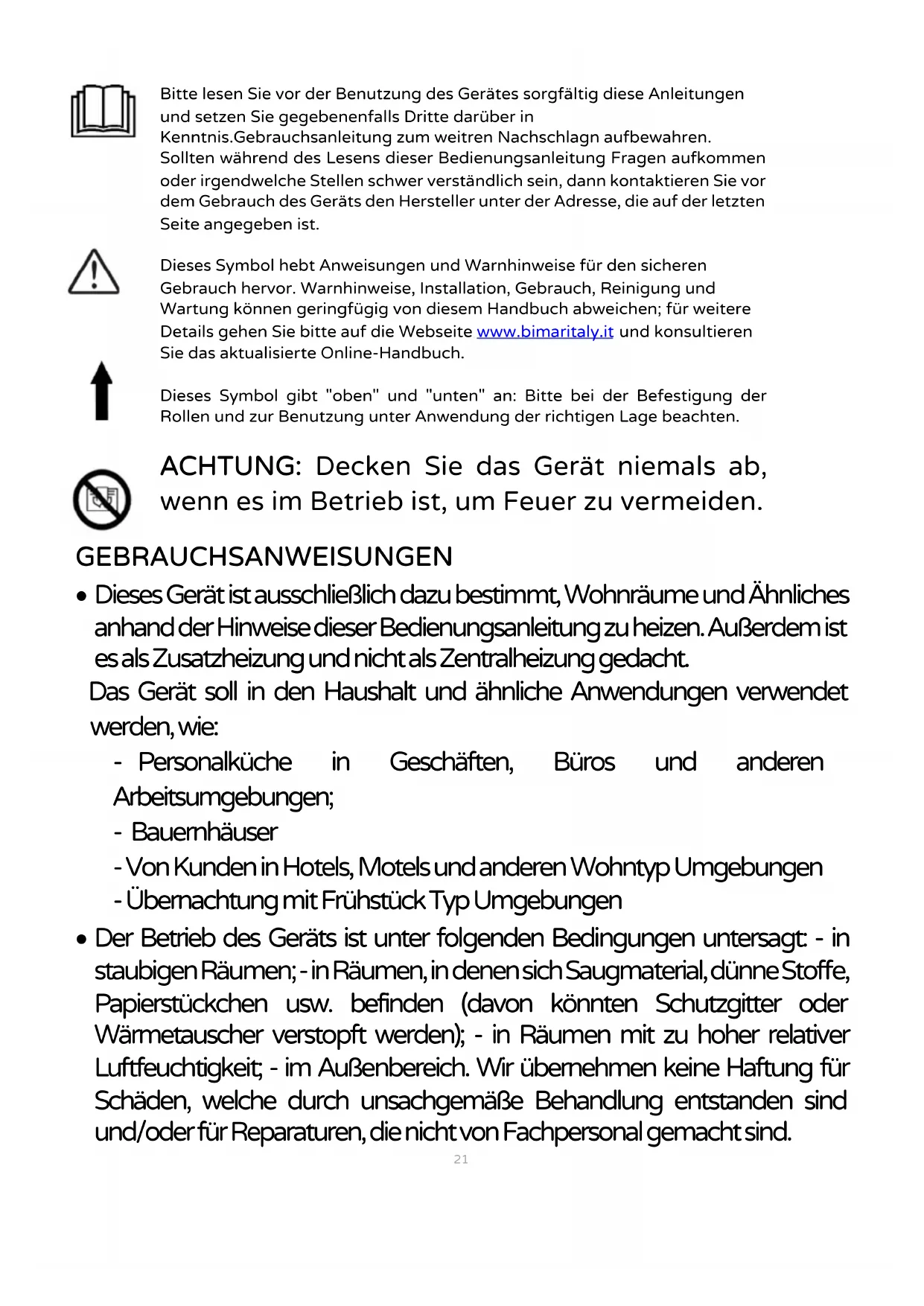 Bitte lesen Sie vor der Benutzung des Gerätes sorgfältig diese Anleitungen und setzen Sie gegebenenfalls Dritte darüber in Kenntnis.Gebrauchsanleitung zum weitren Nachschlagn aufbewahren. Sollten während des Lesens dieser Bedienungsanleitung Fragen aufkommen oder irgendwelche Stellen schwer verständlich sein, dann kontaktieren Sie vor dem Gebrauch des Geräts den Hersteller unter der Adresse, die auf der letzten Seite angegeben ist. Dieses Symbol hebt Anweisungen und Warnhinweise für den sicheren Gebrauch hervor. Warnhinweise, Installation, Gebrauch, Reinigung und Wartung können geringfügig von diesem Handbuch abweichen; für weitere Details gehen Sie bitte auf die Webseite www.bimaritaly.it und konsultieren Sie das aktualisierte Online-Handbuch. Dieses Symbol gibt "oben" und "unten" an: Bitte bei der Befestigung der Rollen und zur Benutzung unter Anwendung der richtigen Lage beachten. ACHTUNG: