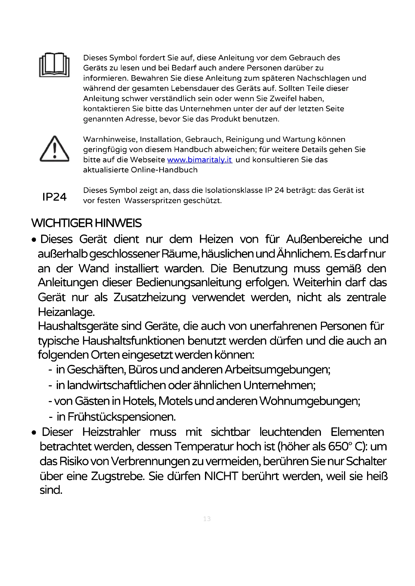IP24 Dieses Symbol fordert Sie auf, diese Anleitung vor dem Gebrauch des Geräts zu lesen und bei Bedarf auch andere Personen darüber zu informieren. Bewahren Sie diese Anleitung zum späteren Nachschlagen und während der gesamten Lebensdauer des Geräts auf. Sollten Teile dieser Anleitung schwer verständlich sein oder wenn Sie Zweifel haben, kontaktieren Sie bitte das Unternehmen unter der auf der letzten Seite genannten Adresse, bevor Sie das Produkt benutzen. Warnhinweise, Installation, Gebrauch, Reinigung und Wartung können geringfügig von diesem Handbuch abweichen; für weitere Details gehen Sie bitte auf die Webseite www.bimaritaly.it und konsultieren Sie das aktualisierte Online-Handbuch Dieses Symbol zeigt an, dass die Isolationsklasse IP 24 beträgt: das Gerät ist vor festen Wasserspritzen geschützt.14