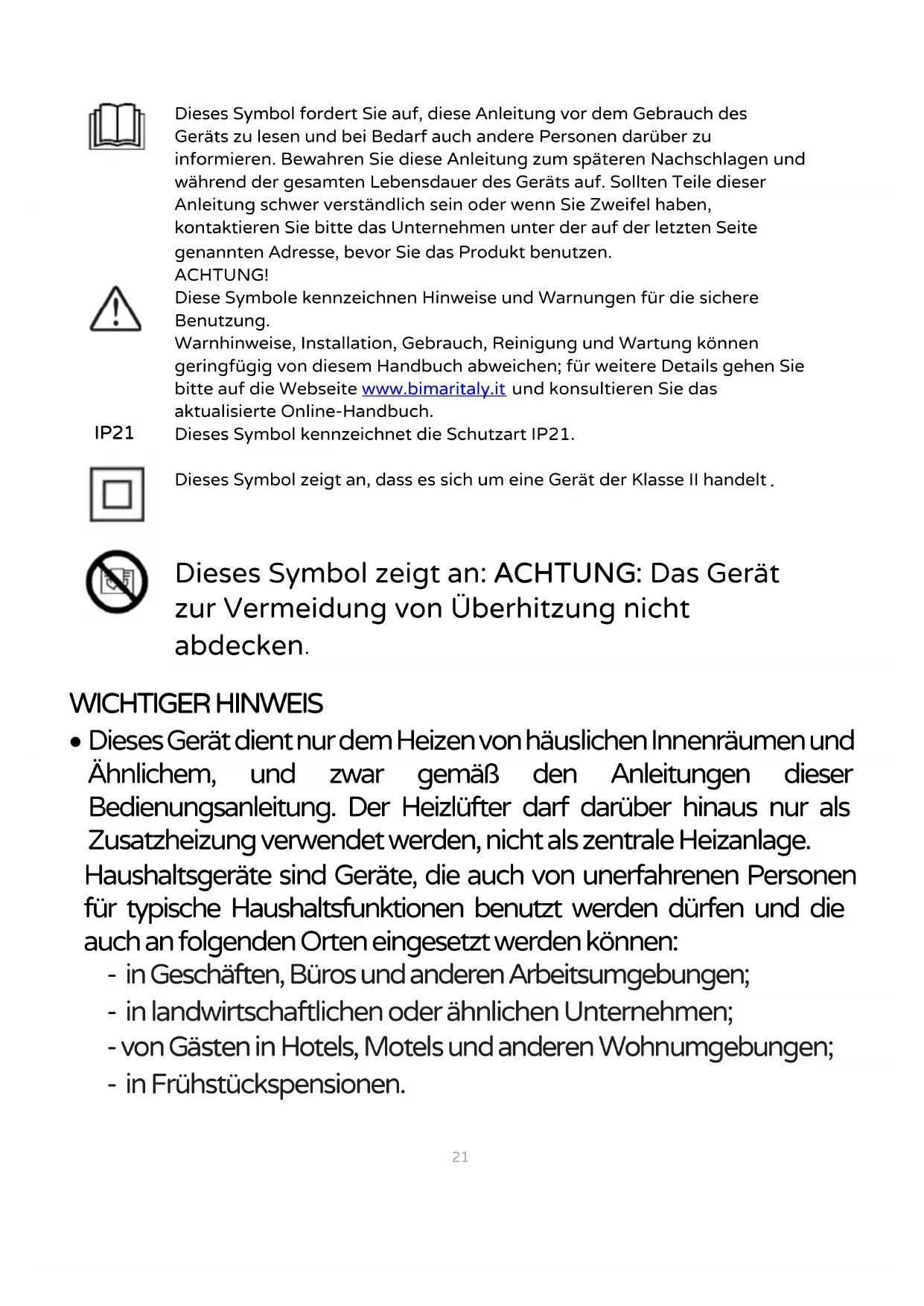 Dieses Symbol fordert Sie auf, diese Anleitung vor dem Gebrauch des Geräts zu lesen und bei Bedarf auch andere Personen darüber zu informieren. Bewahren Sie diese Anleitung zum späteren Nachschlagen und während der gesamten Lebensdauer des Geräts auf. Sollten Teile dieser Anleitung schwer verständlich sein oder wenn Sie Zweifel haben, kontaktieren Sie bitte das Unternehmen unter der auf der letzten Seite genannten Adresse, bevor Sie das Produkt benutzen. ACHTUNG! Diese Symbole kennzeichnen Hinweise und Warnungen für die sichere Benutzung. Warnhinweise, Installation, Gebrauch, Reinigung und Wartung können geringfügig von diesem Handbuch abweichen; für weitere Details gehen Sie bitte auf die Webseite www.bimaritaly.it und konsultieren Sie das aktualisierte Online-Handbuch. Dieses Symbol kennzeichnet die Schutzart IP21. Dieses Symbol zeigt an, dass es sich um eine Gerät der Klasse II handelt