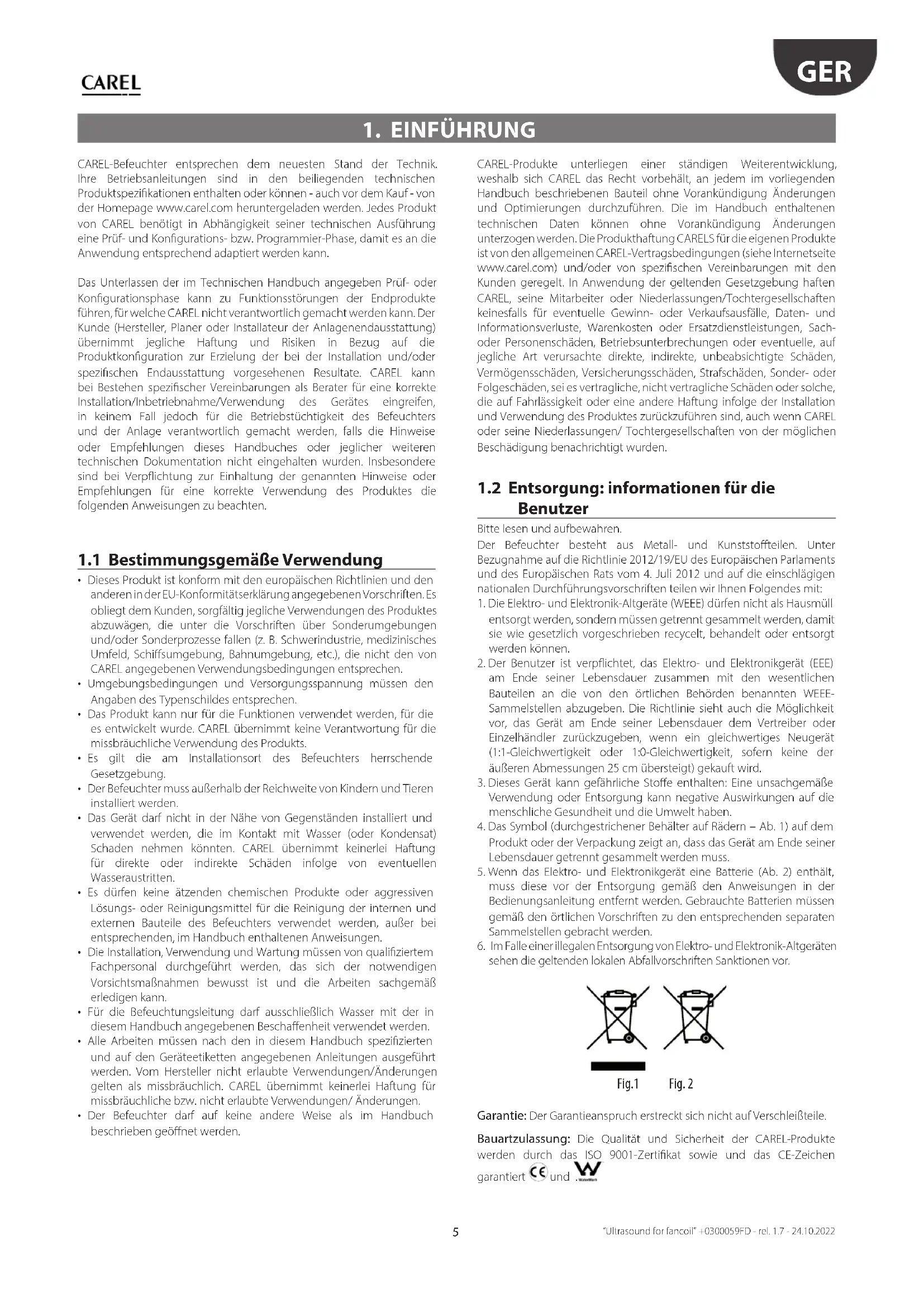 Benutzer Bitte lesen und aufbewahren.Der Befeuchter besteht aus Metall- und Kunststoteilen. Unter Bezugnahme auf die Richtlinie 2012/19/EU des Europäischen Parlaments und des Europäischen Rats vom 4. Juli 2012 und auf die einschlägigen nationalen Durchführungsvorschriften teilen wir Ihnen Folgendes mit:1. Die Elektro- und Elektronik-Altgeräte (WEEE) dürfen nicht als Hausmüll entsorgt werden, sondern müssen getrennt gesammelt werden, damit sie wie gesetzlich vorgeschrieben recycelt, behandelt oder entsorgt werden können.2. Der Benutzer ist verpichtet, das Elektro- und Elektronikgerät (EEE) am Ende seiner Lebensdauer zusammen mit den wesentlichen Bauteilen an die von den örtlichen Behörden benannten WEEE-Sammelstellen abzugeben. Die Richtlinie sieht auch die Möglichkeit vor, das Gerät am Ende seiner Lebensdauer dem Vertreiber oder Einzelhändler zurückzugeben, wenn ein gleichwertiges Neugerät (1:1-Gleichwertigkeit oder 1:0-Gleichwertigkeit, sofern keine der äußeren Abmessungen 25 cm übersteigt) gekauft wird.3. Dieses Gerät kann gefährliche Stoe enthalten: Eine unsachgemäße Verwendung oder Entsorgung kann negative Auswirkungen auf die menschliche Gesundheit und die Umwelt haben.4. Das Symbol (durchgestrichener Behälter auf Rädern – Ab. 1) auf dem Produkt oder der Verpackung zeigt an, dass das Gerät am Ende seiner Lebensdauer getrennt gesammelt werden muss.5. Wenn das Elektro- und Elektronikgerät eine Batterie (Ab. 2) enthält, muss diese vor der Entsorgung gemäß den Anweisungen in der Bedienungsanleitung entfernt werden. Gebrauchte Batterien müssen gemäß den örtlichen Vorschriften zu den entsprechenden separaten Sammelstellen gebracht werden.6. Im Falle einer illegalen Entsorgung von Elektro- und Elektronik-Altgeräten sehen die geltenden lokalen Abfallvorschriften Sanktionen vor. Fig.1 Fig. 2 Garantie: Der Garantieanspruch erstreckt sich nicht auf Verschleißteile. Bauartzulassung: Die Qualität und Sicherheit der CAREL-Produkte werden durch das ISO 9001-Zertikat sowie und das CE-Zeichen garantiert und .