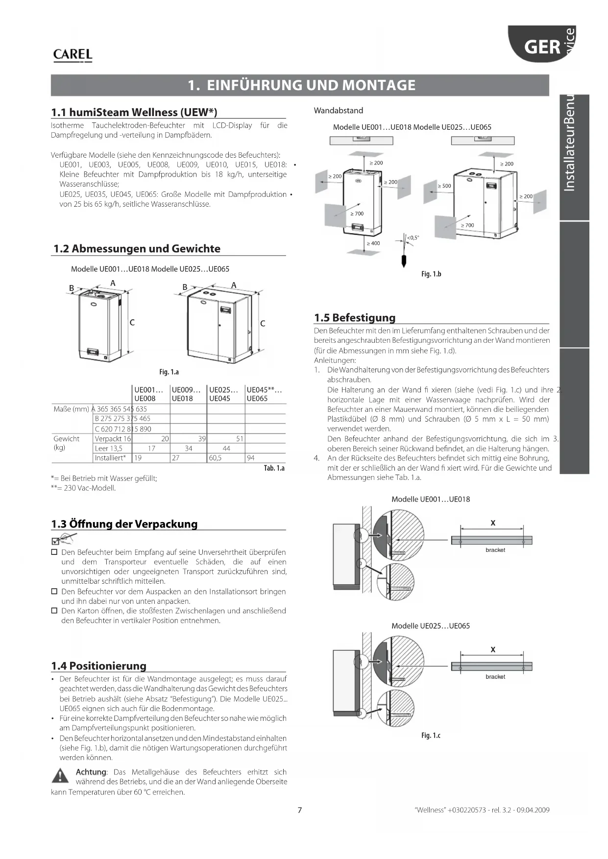 Den Befeuchter mit den im Lieferumfang enthaltenen Schrauben und der bereits angeschraubten Befestigungsvorrichtung an der Wand montieren (für die Abmessungen in mm siehe Fig. 1.d). Anleitungen: Die Wandhalterung von der Befestigungsvorrichtung des Befeuchters 1. abschrauben.Die Halterung an der Wand xieren (siehe (vedi Fig. 1.c) und ihre 2. horizontale Lage mit einer Wasserwaage nachprüfen. Wird der Befeuchter an einer Mauerwand montiert, können die beiliegenden Plastikdübel (Ø 8 mm) und Schrauben (Ø 5 mm x L = 50 mm) verwendet werden.Den Befeuchter anhand der Befestigungsvorrichtung, die sich im 3. oberen Bereich seiner Rückwand be ndet, an die Halterung hängen. An der Rückseite des Befeuchters be ndet sich mittig eine Bohrung, 4. mit der er schließlich an der Wand xiert wird. Für die Gewichte und Abmessungen siehe Tab. 1.a.Modelle UE001…UE018