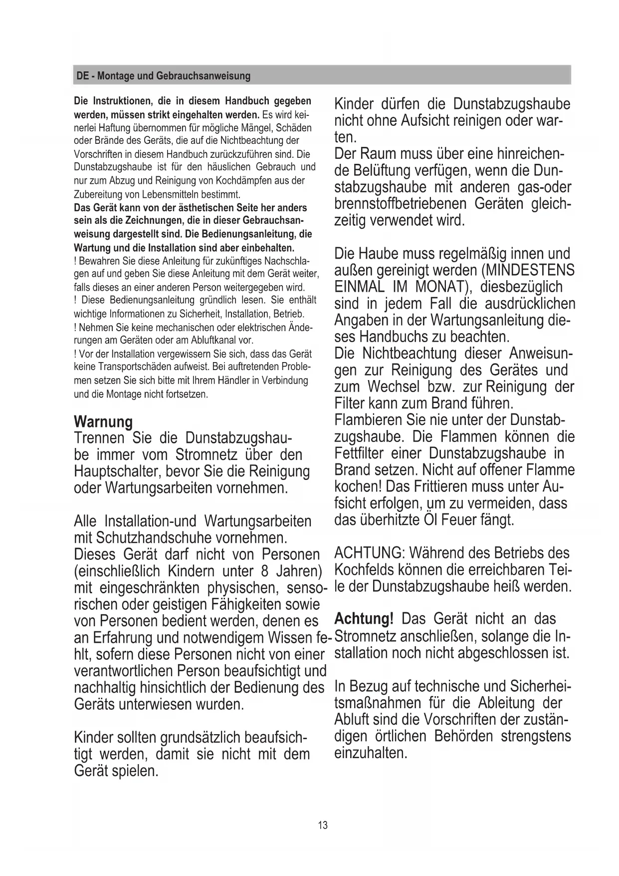 - Place the metal box containing the electronic components in an easily reachable area for possible technical assistance operations, by connecting the electric connectors of the box to the hood (g. 11). How the hood works It is necessary to open the extractable unit in order to ensure the appliance nor- mal operation, by following these steps. Push the glass downwards, as shown in g. 12; the glass will be released and will open. Following the extractable unit opening, it will be possible to operate the suction motor by using the push-button panel, as follows. To close the extractable unit, push on the front glass until the extractable unit is completely closed. T1. T2. T3. Timer ON/OFF key: press it to set the automatic switching off: Speed 1: 20 minutes Speed 2: 15 minutes Speed 3: 10 minutes High Speed : 5 minutes Key to decrease the aspiration speed (power). OFF 1: press it multiple times, in order in order to re- duce the aspiration speed until the hood is turned off. OFF 2: hold it down for a prolonged period of time, at any speed. ON /aspiration speed (power) increase (1-2-3-High speed) key. The High speed lasts about 5 minutes: after that speed 2 is automatically set. Filter saturation indicator The hood displays when it is necessary to carry out mainte- nance on the lters: Grease lter (about every 40 hours of use): all the Leds with blue light will ash Activated charcoal lter (about every 160 hours of use): all the Leds with blue light, leds L2 and L3 will ash. Filter saturation resetting After performing the lter maintenance, press keys T1 and T3, for a prolonged period of time, Leds L1, L2 and L3 will ash shortly with a blue light, and then will turn off. Enabling the activated charcoal lter saturation indica- tor. This indicator is usually disabled. Follow this procedure to enable it: With the hood turned off, press and keep T1 and T2 keys pressed simultaneously for a prolonged period of time: at rst L1 will light up, followed by L2 and L3; then, when the keys are released, leds L2 and L3 will ash shortly to conrm that activation has been completed. Disabling the activated charcoal lter saturation LED: repeat the above mentioned procedure; at rst leds L1, L2 and L3 light up simultaneously; then, when the keys are released, leds L2 and L3 will turn off to conrm that deac- tivation has been completed. MAINTENANCE Grease lter It captures grease particles deriving from cooking. It shall be cleaned once a month (or when the lter satura- tion indicator - in case your model is equipped with this fe- ature- displays that it is necessary), with mild detergent, by washing it by hand or in the dishwasher at low temperature and with a short cycle. The metal grease lter may fade if washed in the dishwa- sher, but its ltering characteristics will remain unchanged. Activated charcoal lter (Filtering Version only) It captures unpleasant odours deriving from cooking. The charcoal lter saturation depends on the usage, on the cooking style and on how often the grease lter is cleaned. In any case, the lter shall be replaced at least every four months. After removing the grease lters, it is possible to t the char- coal lters (Fig. 8).13 DE - Montage und Gebrauchsanweisung Die Instruktionen, die in diesem Handbuch gegeben werden, müssen strikt eingehalten werden. Es wird kei- nerlei Haftung übernommen für mögliche Mängel, Schäden oder Brände des Geräts, die auf die Nichtbeachtung der Vorschriften in diesem Handbuch zurückzuführen sind. Die Dunstabzugshaube ist für den häuslichen Gebrauch und nur zum Abzug und Reinigung von Kochdämpfen aus der Zubereitung von Lebensmitteln bestimmt. Das Gerät kann von der ästhetischen Seite her anders sein als die Zeichnungen, die in dieser Gebrauchsan- weisung dargestellt sind. Die Bedienungsanleitung, die Wartung und die Installation sind aber einbehalten. ! Bewahren Sie diese Anleitung für zukünftiges Nachschla- gen auf und geben Sie diese Anleitung mit dem Gerät weiter, falls dieses an einer anderen Person weitergegeben wird. ! Diese Bedienungsanleitung gründlich lesen. Sie enthält wichtige Informationen zu Sicherheit, Installation, Betrieb. ! Nehmen Sie keine mechanischen oder elektrischen Ände- rungen am Geräten oder am Abluftkanal vor. ! Vor der Installation vergewissern Sie sich, dass das Gerät keine Transportschäden aufweist. Bei auftretenden Proble- men setzen Sie sich bitte mit Ihrem Händler in Verbindung und die Montage nicht fortsetzen. Warnung Trennen Sie die Dunstabzugshau- be immer vom Stromnetz über den Hauptschalter, bevor Sie die Reinigung oder Wartungsarbeiten vornehmen. Alle Installation-und Wartungsarbeiten mit Schutzhandschuhe vornehmen. Dieses Gerät darf nicht von Personen (einschließlich Kindern unter 8 Jahren) mit eingeschränkten physischen, senso- rischen oder geistigen Fähigkeiten sowie von Personen bedient werden, denen es an Erfahrung und notwendigem Wissen fe- hlt, sofern diese Personen nicht von einer verantwortlichen Person beaufsichtigt und nachhaltig hinsichtlich der Bedienung des Geräts unterwiesen wurden. Kinder sollten grundsätzlich beaufsich- tigt werden, damit sie nicht mit dem Gerät spielen. Kinder dürfen die Dunstabzugshaube nicht ohne Aufsicht reinigen oder war- ten. Der Raum muss über eine hinreichen- de Belüftung verfügen, wenn die Dun- stabzugshaube mit anderen gas-oder brennstoffbetriebenen Geräten gleich- zeitig verwendet wird. Die Haube muss regelmäßig innen und außen gereinigt werden (MINDESTENS EINMAL IM MONAT), diesbezüglich sind in jedem Fall die ausdrücklichen Angaben in der Wartungsanleitung die- ses Handbuchs zu beachten. Die Nichtbeachtung dieser Anweisun- gen zur Reinigung des Gerätes und zum Wechsel bzw. zur Reinigung der Filter kann zum Brand führen. Flambieren Sie nie unter der Dunstab- zugshaube. Die Flammen können die Fettlter einer Dunstabzugshaube in Brand setzen. Nicht auf offener Flamme kochen! Das Frittieren muss unter Au- fsicht erfolgen, um zu vermeide