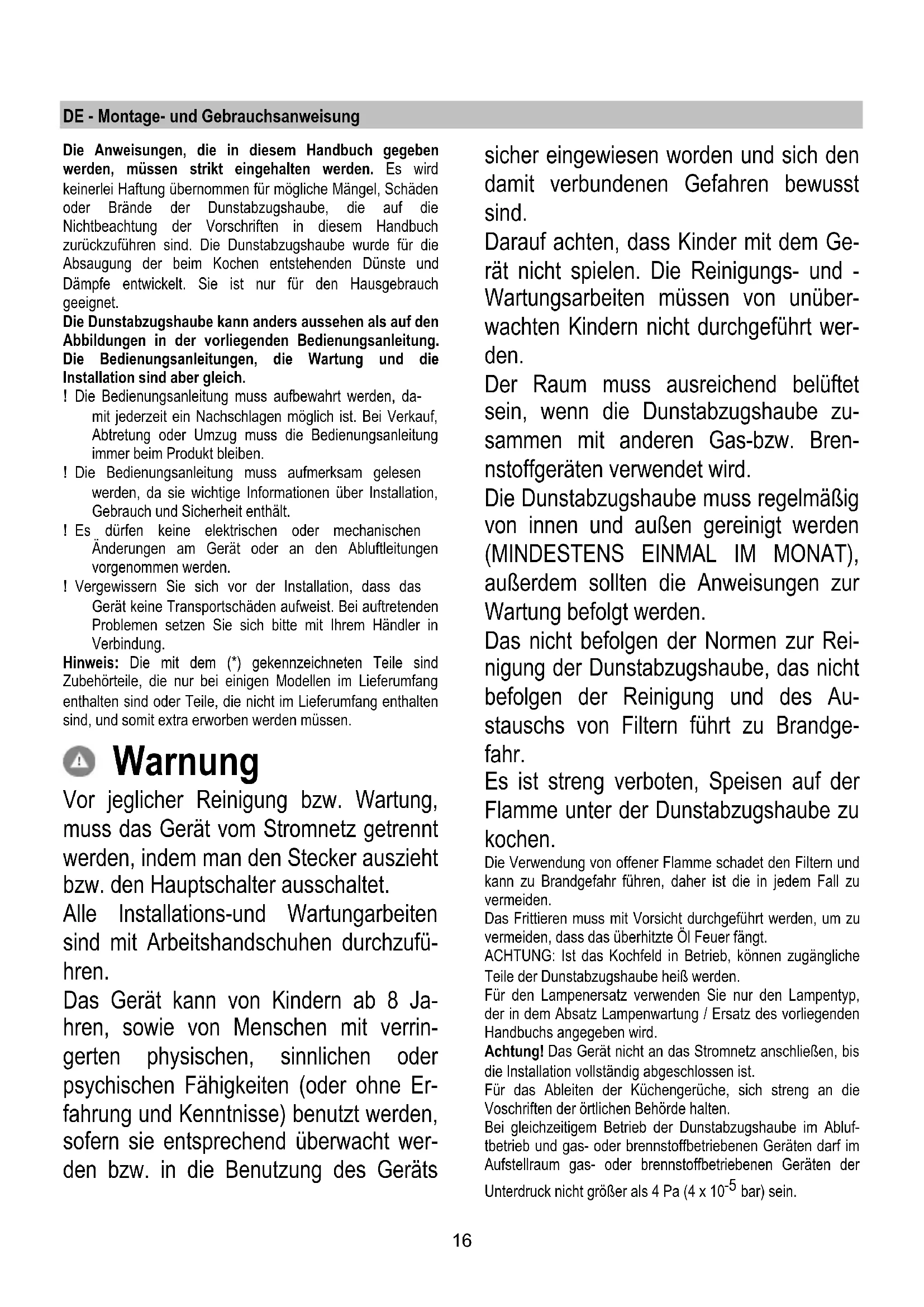 If the lights do not work, make sure that the lamps are fitted properly into their housings before you call for technical assistance.16 DE - Montage- und Gebrauchsanweisung Die Anweisungen, die in diesem Handbuch gegeben werden, müssen strikt eingehalten werden. Es wird keinerlei Haftung übernommen für mögliche Mängel, Schäden oder Brände der Dunstabzugshaube, die auf die Nichtbeachtung der Vorschriften in diesem Handbuch zurückzuführen sind. Die Dunstabzugshaube wurde für die Absaugung der beim Kochen entstehenden Dünste und Dämpfe entwickelt. Sie ist nur für den Hausgebrauch geeignet. Die Dunstabzugshaube kann anders aussehen als auf den Abbildungen in der vorliegenden Bedienungsanleitung. Die Bedienungsanleitungen, die Wartung und die Installation sind aber gleich. ! Die Bedienungsanleitung muss aufbewahrt werden, da- mit jederzeit ein Nachschlagen möglich ist. Bei Verkauf, Abtretung oder Umzug muss die Bedienungsanleitung immer beim Produkt bleiben. ! Die Bedienungsanleitung muss aufmerksam gelesen werden, da sie wichtige Informationen über Installation, Gebrauch und Sicherheit enthält. ! Es dürfen keine elektrischen oder mechanischen Änderungen am Gerät oder an den Abluftleitungen vorgenommen werden. ! Vergewissern Sie sich vor der Installation, dass das Gerät keine Transportschäden aufweist. Bei auftretenden Problemen setzen Sie sich bitte mit Ihrem Händler in Verbindung. Hinweis: Die mit dem (*) gekennzeichneten Teile sind Zubehörteile, die nur bei einigen Modellen im Lieferumfang enthalten sind oder Teile, die nicht im Lieferumfang enthalten sind, und somit extra erworben werden müssen. Warnung Vor jeglicher Reinigung bzw. Wartung, muss das Gerät vom Stromnetz getrennt werden, indem man den Stecker auszieht bzw. den Hauptschalter ausschaltet. Alle Installations-und Wartungarbeiten sind mit Arbeitshandschuhen durchzufü- hren. Das Gerät kann von Kindern ab 8 Ja- hren, sowie von Menschen mit verrin- gerten physischen, sinnlichen oder psychischen Fähigkeiten (oder ohne Er- fahrung und Kenntnisse) benutzt werden, sofern sie entsprechend überwacht wer- den bzw. in die Benutzung des Geräts sicher eingewiesen worden und sich den damit verbundenen Gefahren bewusst sind. Darauf achten, dass Kinder mit dem Ge- rät nicht spielen. Die Reinigungs- und - Wartungsarbeiten müssen von unüber- wachten Kindern nicht durchgeführt wer- den. Der Raum muss ausreichend belüftet sein, wenn die Dunstabzugshaube zu- sammen mit anderen Gas-bzw. Bren- nstoffgeräten verwendet wird. Die Dunstabzugshaube muss regelmäßig von innen und außen gereinigt werden (MINDESTENS EINMAL IM MONAT), außerdem sollten die Anweisungen zur Wartung befolgt werden. Das nicht befolgen der Normen zur Rei- nigung der Dunstabzugshaube, das nicht befolgen der Reinigung und des Au- stauschs von Filtern führt zu Brandge- fahr. Es ist streng verboten, Speisen auf der Flamme unter der Dunstabzugshaube zu kochen. Die Verwendung von offener Flamme schadet den Filtern und kann zu Brandgefahr führen, daher ist die in jedem Fall zu vermeiden. Das Frittieren muss mit Vorsicht durchgeführt werden, um zu vermeiden, dass das überhitzte Öl Feuer fängt. ACHTUNG: Ist das Kochfeld in Betrieb, können zugängliche Teile der Dunstabzugshaube heiß werden. Für den Lampenersatz verwenden Sie nur den Lampentyp, der in dem Absatz Lampenwartung / Ersatz des vorliegenden Handbuchs angegeben wird. Achtung! Das Gerät nicht an das Stromnetz anschließen, bis die Installation vollständig abgeschlossen ist. Für das Ableiten der Küchengerüche, sich streng an die Voschriften der örtlichen Behörde halten. Bei gleichzeitigem Betrieb der Dunstabzugshaube im Abluf- tbetrieb und gas- oder brennstoffbetriebenen Geräten darf im Aufstellraum gas- oder brennstoffbetriebenen Geräten der Unterdruck nicht größer als 4 Pa (4 x 10