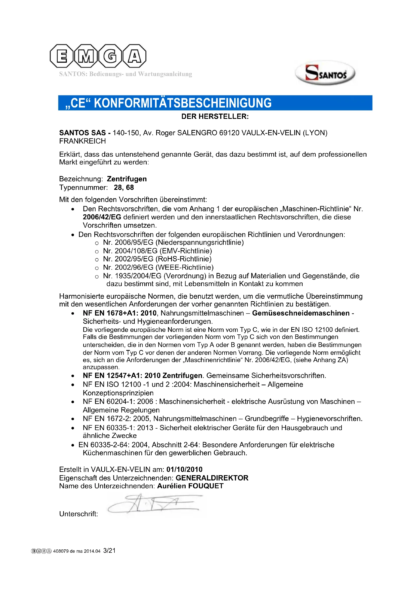 DER HERSTELLER: SANTOS SAS - 140-150, Av. Roger SALENGRO 69120 VAULX-EN-VELIN (LYON) FRANKREICH Erklärt, dass das untenstehend genannte Gerät, das dazu bestimmt ist, auf dem professionellen Markt eingeführt zu werden: Bezeichnung: Zentrifugen Typennummer: 28, 68 Mit den folgenden Vorschriften übereinstimmt: Den Rechtsvorschriften, die vom Anhang 1 der europäischen „Maschinen-Richtlinie“ Nr. 2006/42/EG definiert werden und den innerstaatlichen Rechtsvorschriften, die diese Vorschriften umsetzen. Den Rechtsvorschriften der folgenden europäischen Richtlinien und Verordnungen: o Nr. 2006/95/EG (Niederspannungsrichtlinie) o Nr. 2004/108/EG (EMV-Richtlinie) o Nr. 2002/95/EG (RoHS-Richtlinie) o Nr. 2002/96/EG (WEEE-Richtlinie) o Nr. 1935/2004/EG (Verordnung) in Bezug auf Materialien und Gegenstände, die dazu bestimmt sind, mit Lebensmitteln in Kontakt zu kommen Harmonisierte europäische Normen, die benutzt werden, um die vermutliche Übereinstimmung mit den wesentlichen Anforderungen der vorher genannten Richtlinien zu bestätigen. NF EN 1678+A1: 2010, Nahrungsmittelmaschinen – Gemüseschneidemaschinen - Sicherheits- und Hygieneanforderungen. Die vorliegende europäische Norm ist eine Norm vom Typ C, wie in der EN ISO 12100 definiert. Falls die Bestimmungen der vorliegenden Norm vom Typ C sich von den Bestimmungen unterscheiden, die in den Normen vom Typ A oder B genannt werden, haben die Bestimmungen der Norm vom Typ C vor denen der anderen Normen Vorrang. Die vorliegende Norm ermöglicht es, sich an die Anforderungen der „Maschinenrichtlinie“ Nr. 2006/42/EG, (siehe Anhang ZA) anzupassen. NF EN 12547+A1: 2010 Zentrifugen. Gemeinsame Sicherheitsvorschriften. NF EN ISO 12100 -1 und 2 :2004: Maschinensicherheit – Allgemeine Konzeptionsprinzipien NF EN 60204-1: 2006 : Maschinensicherheit - elektrische Ausrüstung von Maschinen – Allgemeine Regelungen NF EN 1672-2: 2005, Nahrungsmittelmaschinen – Grundbegriffe – Hygienevorschriften. NF EN 60335-1: 2013 - Sicherheit elektrischer Geräte für den Hausgebrauch und ähnliche Zwecke EN 60335-2-64: 2004, Abschnitt 2-64: Besondere Anforderungen für elektrische Küchenmaschinen für den gewerblichen Gebrauch. Erstellt in VAULX-EN-VELIN am: 01/10/2010 Eigenschaft des Unterzeichnenden: GENERALDIREKTOR Name des Unterzeichnenden: Aurélien FOUQUET Unterschrift: 408079 de ma 2014.04 3/21SANTOS: Bedienungs- und Wartungsanleitung 98168 DE 1.0 - 12 2013 4 / 22 www.santos.fr WICHTIGE SICHERHEITSHINWEISE Wie bei allen anderen elektrischen Geräten, sind auch bei der Verwendung dieses Gerätes folgende Sicherheitshinweise zu beachten: Alle Anweisungen lesen. AUFBAU, TRANSPORT ACHTUNG Bei jedem Transport der Maschine, auch beim Auspacken, darf das Gerät nicht am Anziehgriff (1) der Abdeckung gehalten oder gehoben werden. Eine einzige Person wird zum Transport des Geräts benötigt. Für höheren Komfort beim Gebrauch empfehlen wir, das Gerät auf einem Tisch oder einer Arbeitsplatte aufzustellen, so dass sich der Auslauf für den Saft sowie Ein- (11) und Ausschalter (12), in Reichweite befinden (empfohlene Höhe je nach Benutzer ca. 90 cm). Bei Reinigung und Aufstellung Vorsicht walten lassen, den kompletten Korb (5) umsichtig behandeln, damit er sich nicht verformt und der Betrieb des Geräts beeinträchtigt wird. SACHWIDRIGER EINSATZ