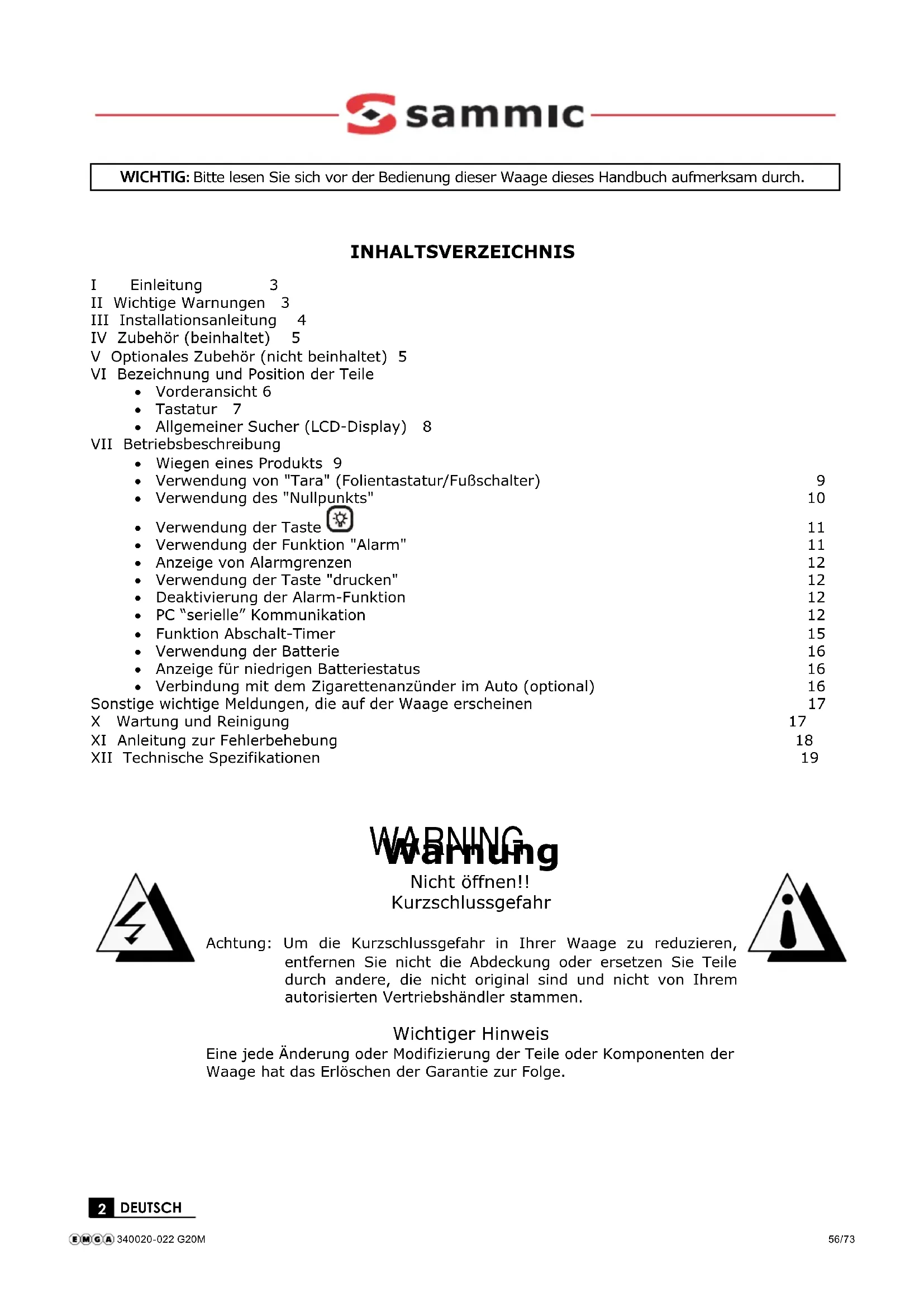 Verwendung der Funktion "Alarm" 11 Anzeige von Alarmgrenzen 12 Verwendung der Taste "drucken" 12 Deaktivierung der Alarm-Funktion 12 PC “serielle” Kommunikation 12 Funktion Abschalt-Timer 15 Verwendung der Batterie 16 Anzeige für niedrigen Batteriestatus 16 Verbindung mit dem Zigarettenanzünder im Auto (optional) 16 Sonstige wichtige Meldungen, die auf der Waage erscheinen 17 X Wartung und Reinigung 17XI Anleitung zur Fehlerbehebung 18XII Technische Spezifikationen 19 WARNING