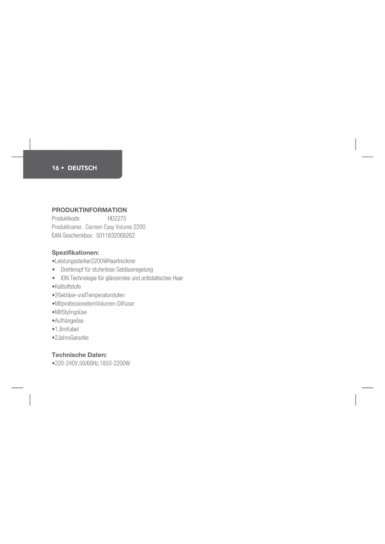 Laden Sie die Anleitung für Ihr Haartrockner kostenlos im PDF-Format! Finden Sie Ihr Handbuch Easy Volume 2200 HD2275 - Carmen und nehmen Sie Ihr elektronisches Gerät wieder in die Hand. Auf dieser Seite sind alle Dokumente veröffentlicht, die für die Verwendung Ihres Geräts notwendig sind. Easy Volume 2200 HD2275 von der Marke Carmen.