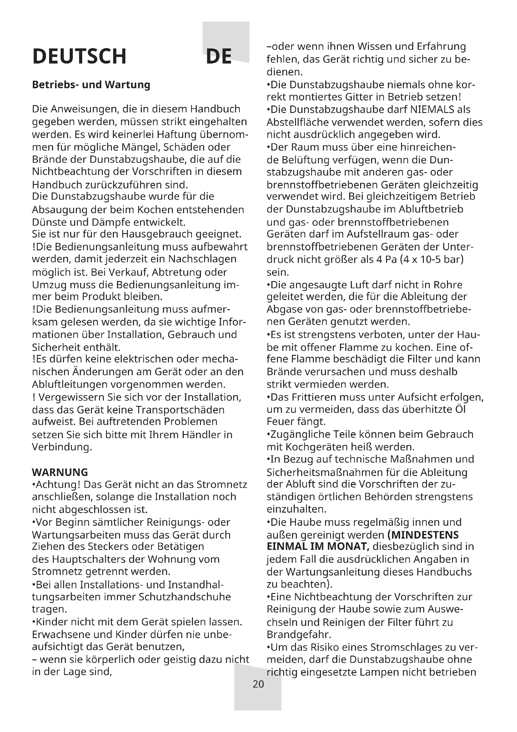 DEUTSCH Betriebs- und Wartung Die Anweisungen, die in diesem Handbuch gegeben werden, müssen strikt eingehalten werden. Es wird keinerlei Haftung übernom- men für mögliche Mängel, Schäden oder Brände der Dunstabzugshaube, die auf die Nichtbeachtung der Vorschriften in diesem Handbuch zurückzuführen sind. Die Dunstabzugshaube wurde für die Absaugung der beim Kochen entstehenden Dünste und Dämpfe entwickelt. Sie ist nur für den Hausgebrauch geeignet. !Die Bedienungsanleitung muss aufbewahrt werden, damit jederzeit ein Nachschlagen möglich ist. Bei Verkauf, Abtretung oder Umzug muss die Bedienungsanleitung im- mer beim Produkt bleiben. !Die Bedienungsanleitung muss aufmer- ksam gelesen werden, da sie wichtige Infor- mationen über Installation, Gebrauch und Sicherheit enthält. !Es dürfen keine elektrischen oder mecha- nischen Änderungen am Gerät oder an den Abluftleitungen vorgenommen werden. ! Vergewissern Sie sich vor der Installation, dass das Gerät keine Transportschäden aufweist. Bei auftretenden Problemen setzen Sie sich bitte mit Ihrem Händler in Verbindung. WARNUNG