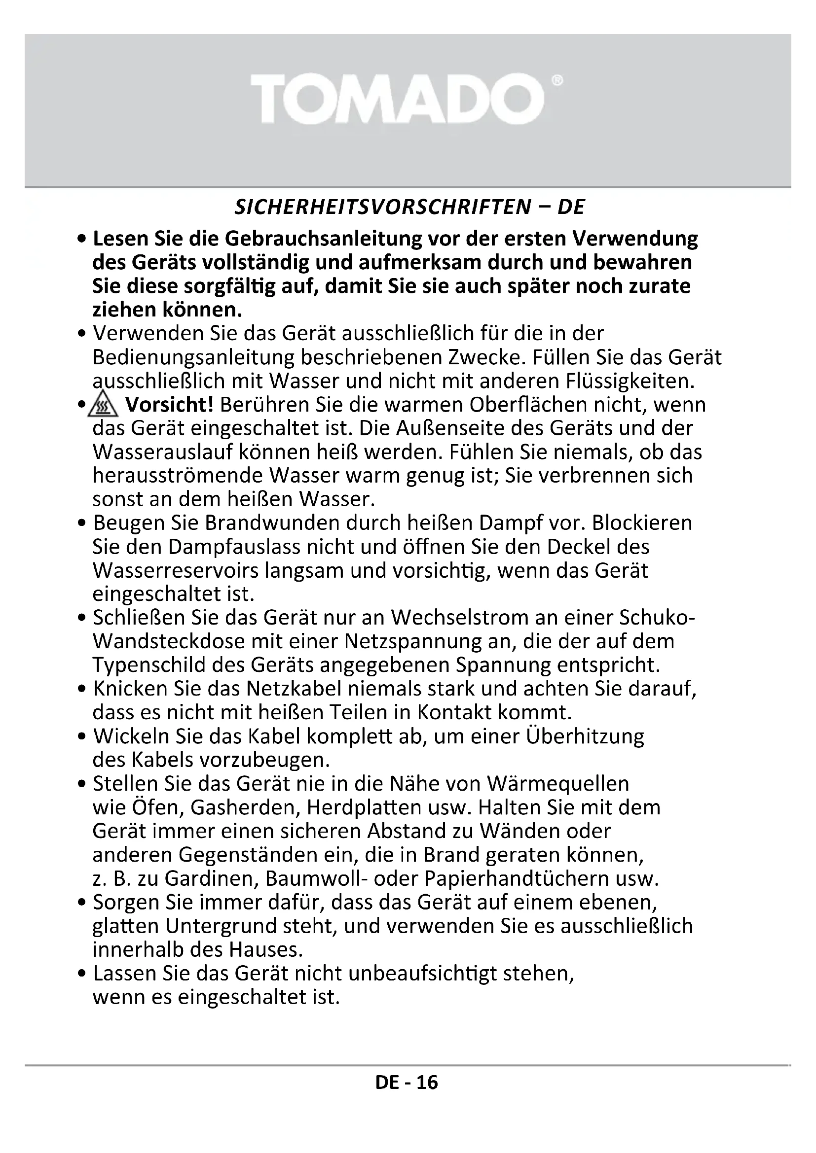 - Verwenden Sie das Gerät ausschließlich für die in der Bedienungsanleitung beschriebenen Zwecke. Füllen Sie das Gerät ausschließlich mit Wasser und nicht mit anderen Flüssigkeiten.