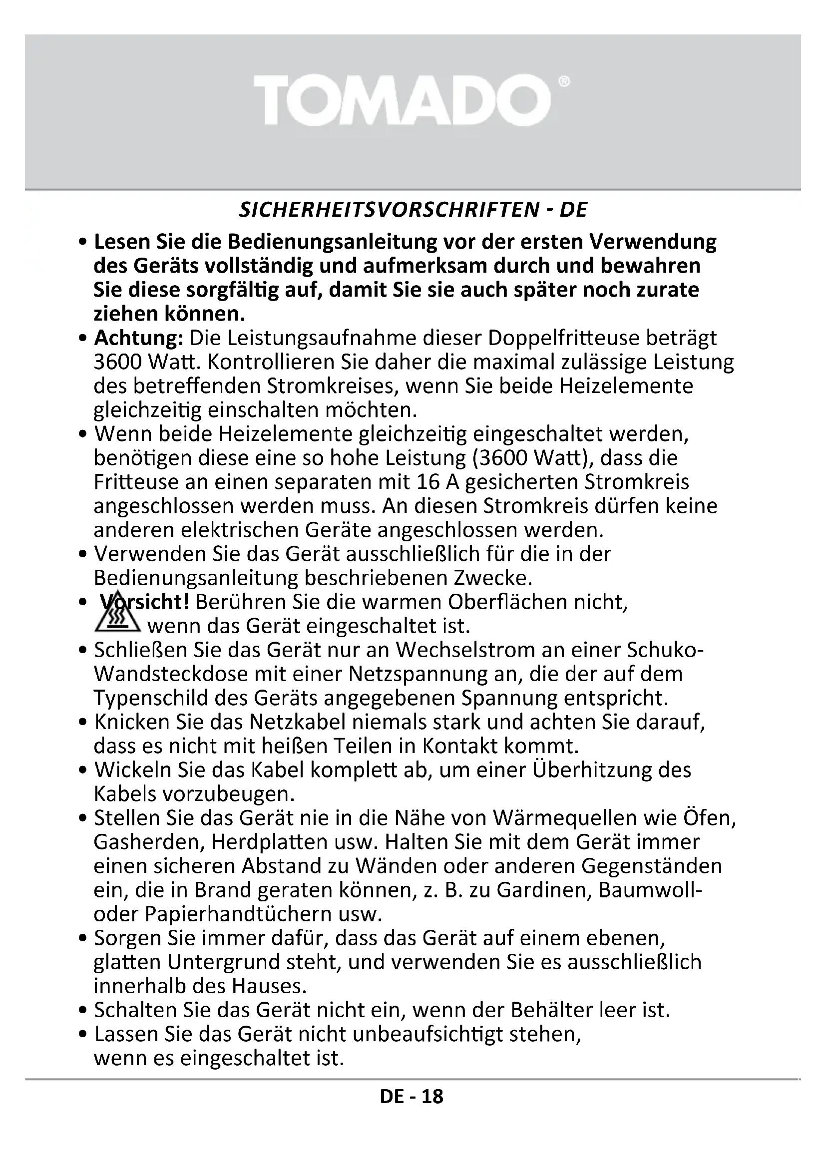 - Achtung: Die Leistungsaufnahme dieser Doppelfritteuse beträgt 3600 Watt. Kontrollieren Sie dazu die maximal zulässige Leistung des betreffenden Stromkreises, wenn Sie bereits Heizelemente gleichzeitig einschalten können.