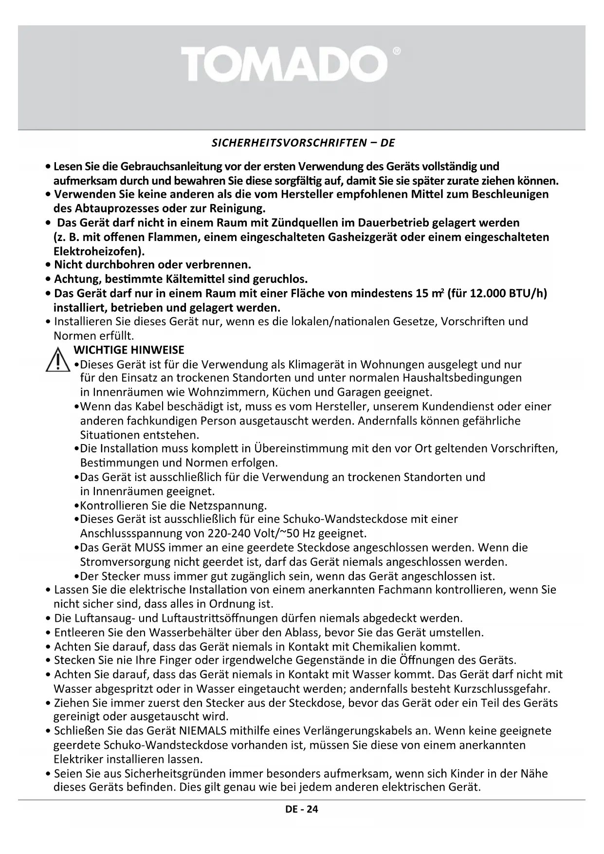 - Das Gerät darf nur in einem Raum mit einer Fläche von mindestens 15 m