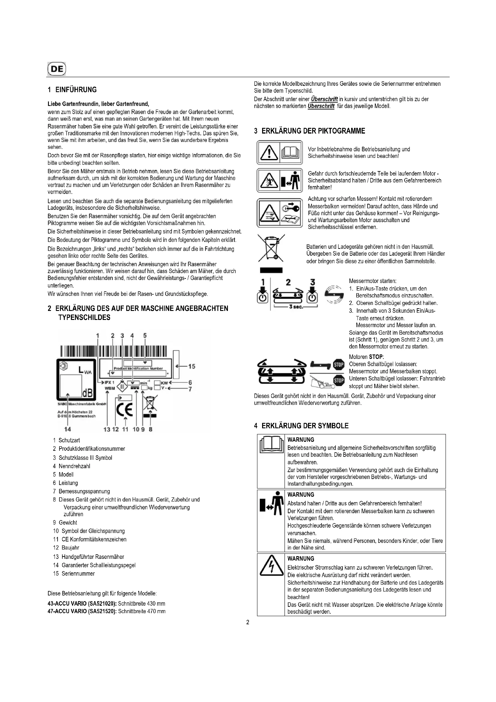 Diese Betriebsanleitung gilt für folgende Modelle: 43-ACCU VARIO (SA521020): Schnittbreite 430 mm 47-ACCU VARIO (SA521520): Schnittbreite 470 mm Die korrekte Modellbezeichnung Ihres Gerätes sowie die Seriennummer entnehmen Sie bitte dem Typenschild. Der Abschnitt unter einer Überschrift in kursiv und unterstrichen gilt bis zu der nächsten so markierten Überschrift für das jeweilige Modell.
