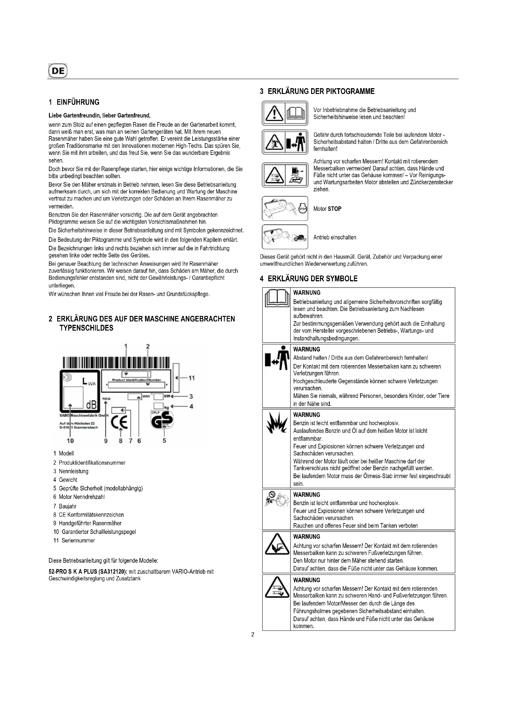 Diese Betriebsanleitung gilt für folgende Modelle: 52-PRO S K A PLUS (SA312120): mit zuschaltbarem VARIO-Antrieb mit Geschwindigkeitsreglung und Zusatztank
