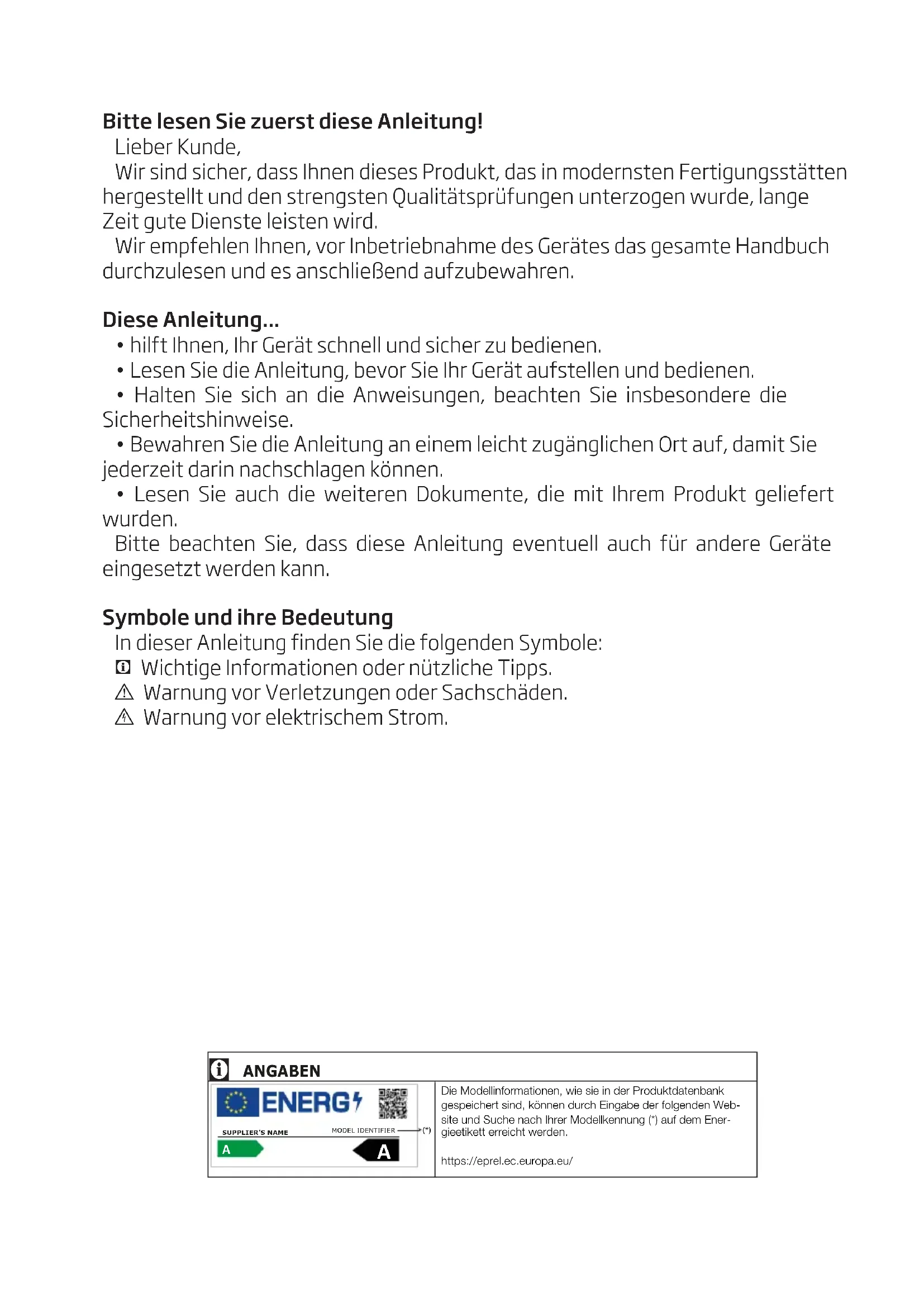 - Lesen Sie die Anleitung, bevor Sie Ihr Gerät aufstellen und bedienen.