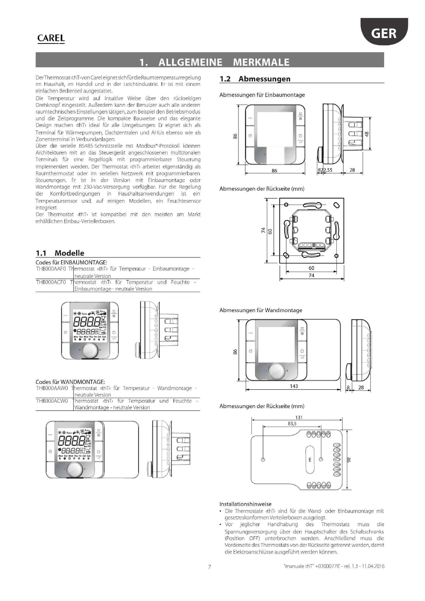 Codes für EINBAUMONTAGE: THB000AAF0 Thermostat ‹thT› für Temperatur - Einbaumontage - neutrale VersionTHB000ACF0 Thermostat ‹thT› für Temperatur und Feuchte - Einbaumontage - neutrale Version Codes für WANDMONTAGE: THB000AAW0 Thermostat ‹thT› für Temperatur - Wandmontage - neutrale VersionTHB000ACW0 Thermostat ‹thT› für Temperatur und Feuchte - Wandmontage - neutrale Version