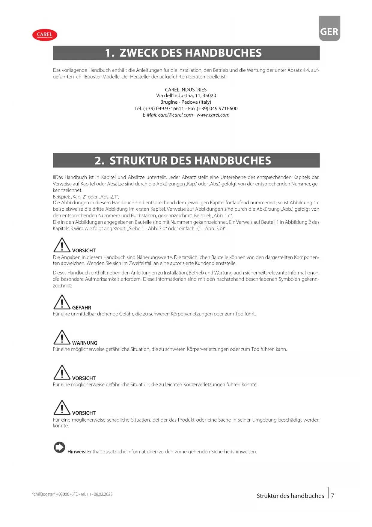 GER Struktur des handbuches “chillBooster” +0300076FD - rel. 1.1 - 08.02.2023 Das vorliegende Handbuch enthält die Anleitungen für die Installation, den Betrieb und die Wartung der unter Absatz 4.4. auf- geführten chillBooster-Modelle. Der Hersteller der aufgeführten Gerätemodelle ist: CAREL INDUSTRIES Via dell’Industria, 11, 35020 Brugine - Padova (Italy) Tel. (+39) 049.9716611 - Fax (+39) 049.9716600 E-Mail: carel@carel.com - www.carel.com