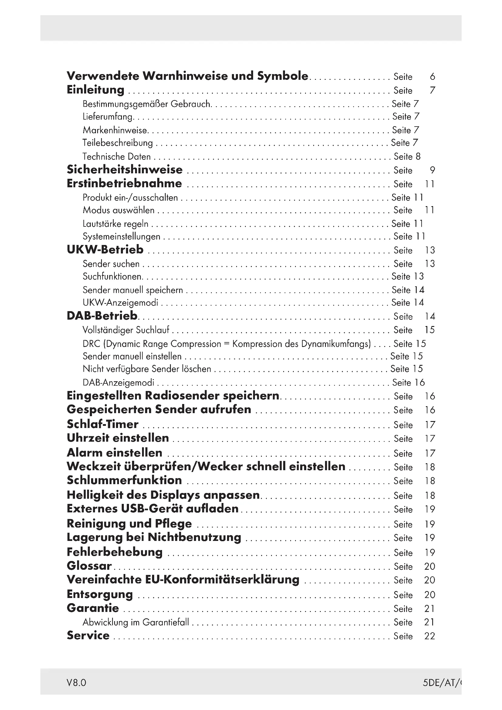 [2] [4][3]5DE/AT/CH Verwendete Warnhinweise und Symbole................. Seite 6 Einleitung ...................................................... Seite 7 Bestimmungsgemäßer Gebrauch..................................... Seite 7 Lieferumfang..................................................... Seite 7 Markenhinweise.................................................. Seite 7 Teilebeschreibung ................................................ Seite 7 Technische Daten ................................................. Seite 8 Sicherheitshinweise .......................................... Seite 9 Erstinbetriebnahme .......................................... Seite 11 Produkt ein-/ausschalten ........................................... Seite 11 Modus auswählen ................................................ Seite 11 Lautstärke regeln ................................................. Seite 11 Systemeinstellungen ............................................... Seite 11 UKW-Betrieb .................................................. Seite 13 Sender suchen ................................................... Seite 13 Suchfunktionen................................................... Seite 13 Sender manuell speichern .......................................... Seite 14 UKW-Anzeigemodi ............................................... Seite 14 DAB-Betrieb.................................................... Seite 14 Vollständiger Suchlauf ............................................. Seite 15 DRC (Dynamic Range Compression = Kompression des Dynamikumfangs) .... Seite 15 Sender manuell einstellen .......................................... Seite 15 Nicht verfügbare Sender löschen .................................... Seite 15 DAB-Anzeigemodi ................................................ Seite 16 Eingestellten Radiosender speichern....................... Seite 16 Gespeicherten Sender aufrufen ............................ Seite 16 Schlaf-Timer ................................................... Seite 17 Uhrzeit einstellen ............................................. Seite 17 Alarm einstellen .............................................. Seite 17 Weckzeit überprüfen/Wecker schnell einstellen ......... Seite 18 Schlummerfunktion .......................................... Seite 18 Helligkeit des Displays anpassen........................... Seite 18 Externes USB-Gerät aufladen ............................... Seite 19 Reinigung und Pflege ........................................ Seite 19 Lagerung bei Nichtbenutzung .............................. Seite 19 Fehlerbehebung .............................................. Seite 19 Glossar......................................................... Seite 20 Vereinfachte EU-Konformitätserklärung .................. Seite 20 Entsorgung .................................................... Seite 20 Garantie ....................................................... Seite 21 Abwicklung im Garantiefall ......................................... Seite 21 Service ......................................................... Seite 22 V8.06 DE/AT/CH Verwendete Warnhinweise und Symbole In der Bedienungsanleitung, der Kurzanleitung, auf der Verpackung, auf dem Produkt und auf dem Steckernetzteil werden die folgenden Warnhinweise verwendet: GEFAHR! Dieses Symbol mit dem Signalwort „Gefahr“ bezeichnet eine Gefährdung mit einem hohen Risikograd, die, wenn sie nicht vermieden wird, eine schwere Verletzung oder den Tod zur Folge hat. WARNUNG! Dieses Symbol mit dem Signalwort „Warnung“ bezeichnet eine Gefährdung mit einem mittleren Risikograd, die, wenn sie nicht vermieden wird, eine schwere Verletzung oder den Tod zur Folge haben kann. VORSICHT! Dieses Symbol mit dem Signalwort „Vorsicht“ bezeichnet eine Gefährdung mit einem niedrigen Risikograd, die, wenn sie nicht vermieden wird, eine geringe oder mäßige Verletzung zur Folge haben kann. ACHTUNG! Dieses Symbol mit dem Signalwort „Achtung“ zeigt die Gefahr einer möglichen Sachbeschädigung an. HINWEIS: Dieses Symbol mit dem Signalwort „Hinweis“ bietet weitere nützliche Informationen. Verwenden Sie das Produkt nur in trockenen Innenräumen. Schutzklasse III Das Radio darf (mit Ausnahme des Steckernetzteils) nur unter Anwendung von Schutzkleinspannung (SELV) betrieben werden. Symbol für ein Produkt der Schutzklasse II Dieses Symbol bedeutet, dass vor der Verwendung des Produkts die Bedienungsanleitung zu beachten ist. Wechselstrom/-spannung Gleichstrom/-spannung Dieses Symbol weist auf die besonderen Verhaltensregeln im Zusammenhang mit Kindern hin.7DE/AT/CH Polarität des Hohlsteckers Das CE-Zeichen bestätigt Konformität mit den für das Produkt zutreffenden EU-Richtlinien. DAB+ RADIO Einleitung Wir beglückwünschen Sie zum Kauf Ihres neuen Produkts. Sie haben sich damit für ein hochwertiges Produkt entschieden. Die Bedienungsanleitung ist Teil dieses Produkts. Sie enthält wichtige Hinweise für Sicherheit, Gebrauch und Entsorgung. Machen Sie sich vor der Benutzung des Produkts mit allen Bedien- und Sicherheitshinweisen vertraut. Benutzen Sie das Produkt nur wie beschrieben und für die angegebenen Einsatzbereiche. Händigen Sie alle Unterlagen bei Weitergabe des Produkts an Dritte mit aus. Bestimmungsgemäßer Gebrauch Das DAB+ Radio (nachfolgend „Produkt“ genannt) ist ein Gerät der Unterhaltungselektronik. Es dient dem Empfang und der Wiedergabe von analogen und digitalen Radioprogrammen. Dieses Produkt darf nur privat und nicht für industrielle oder gewerbliche Zwecke verwendet werden. Dieses Produkt darf nicht in tropischen Klimazonen verwendet werden. Jede andere Verwendung gilt als unsachgemäß. Ansprüche aufgrund unsachgemäßer Verwendung oder aufgrund unbefugter Modifizierungen am Produkt werden vom Garantieumfang nicht erfasst. Jegliche derartige Nutzung erfolgt auf eigenes Risiko. Lieferumfang Überprüfen Sie nach dem Auspacken des Produktes, ob die Lieferung vollständig ist und alle Te