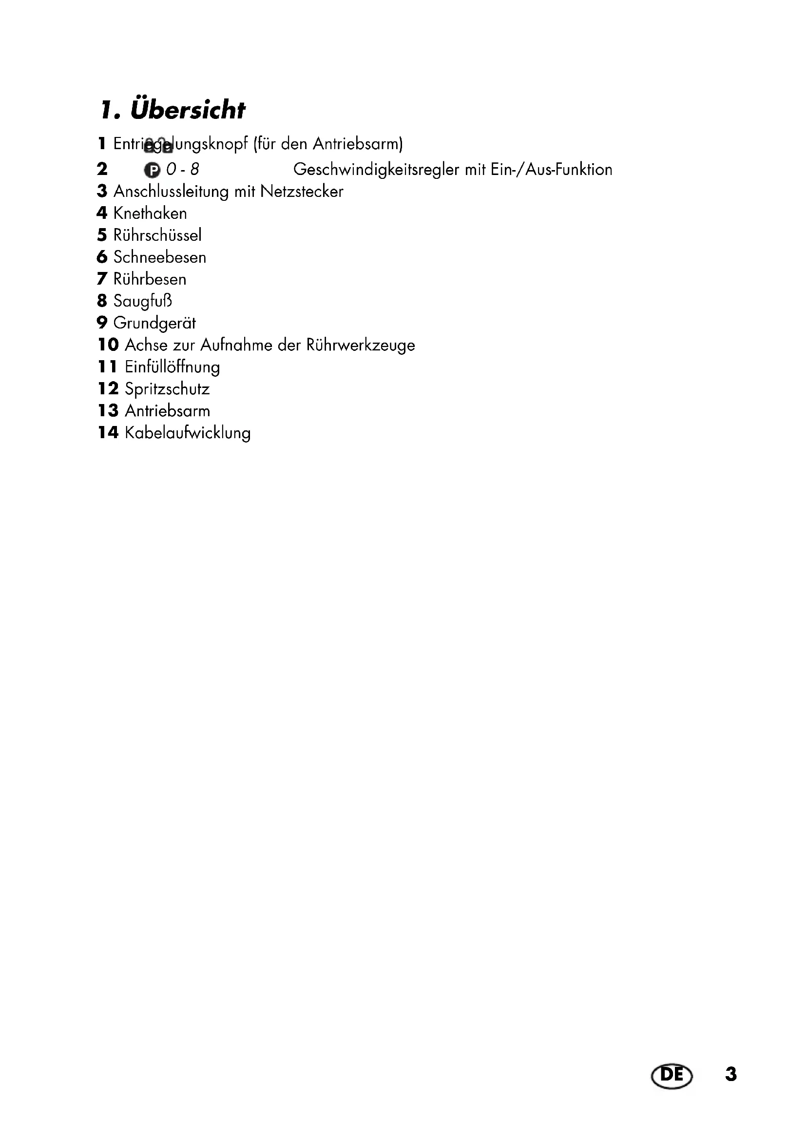 1 Entriegelungsknopf (für den Antriebsarm) 2 0 - 8 Geschwindigkeitsregler mit Ein-/Aus-Funktion 3 Anschlussleitung mit Netzstecker 4 Knethaken 5 Rührschüssel 6 Schneebesen 7 Rührbesen 8 Saugfuß 9 Grundgerät 10 Achse zur Aufnahme der Rührwerkzeuge 11 Einfüllöffnung 12 Spritzschutz 13 Antriebsarm 14 Kabelaufwicklung