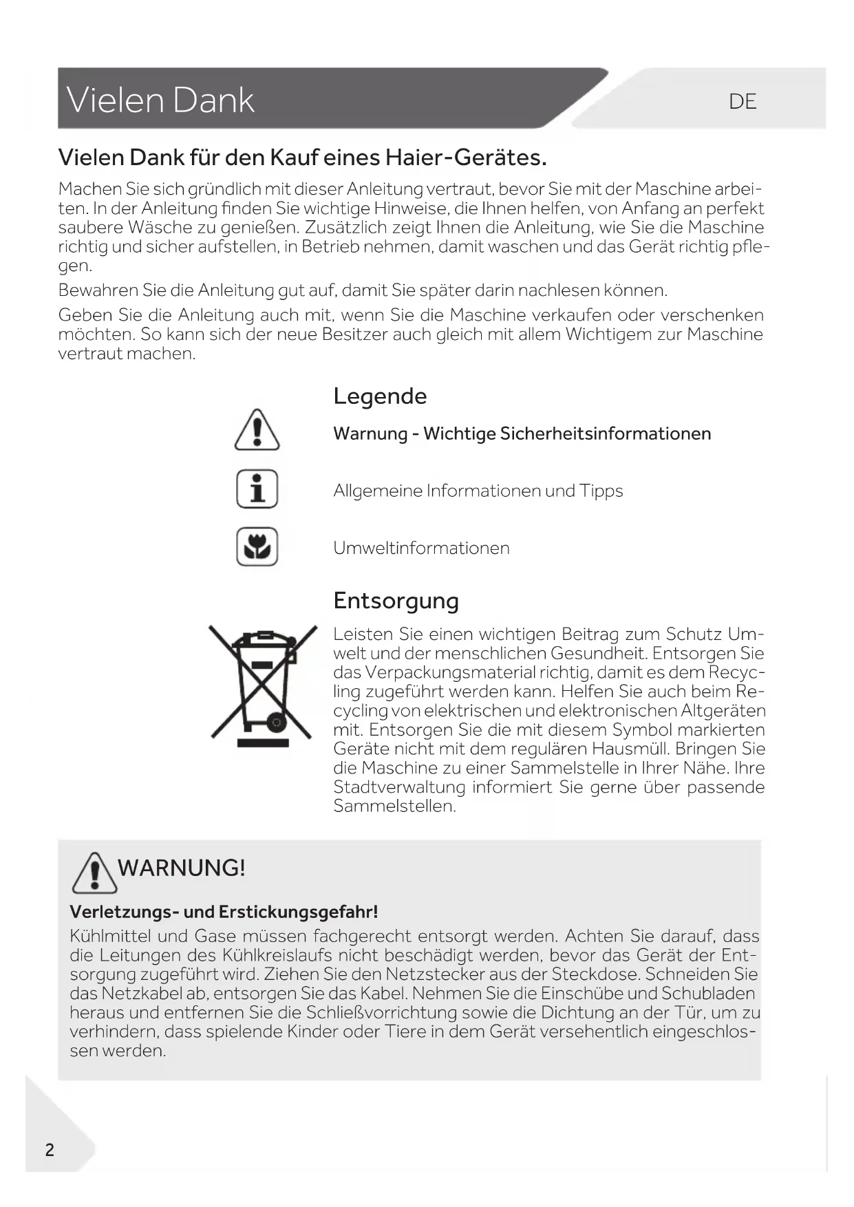 Vielen Dank für den Kauf eines Haier-Gerätes.