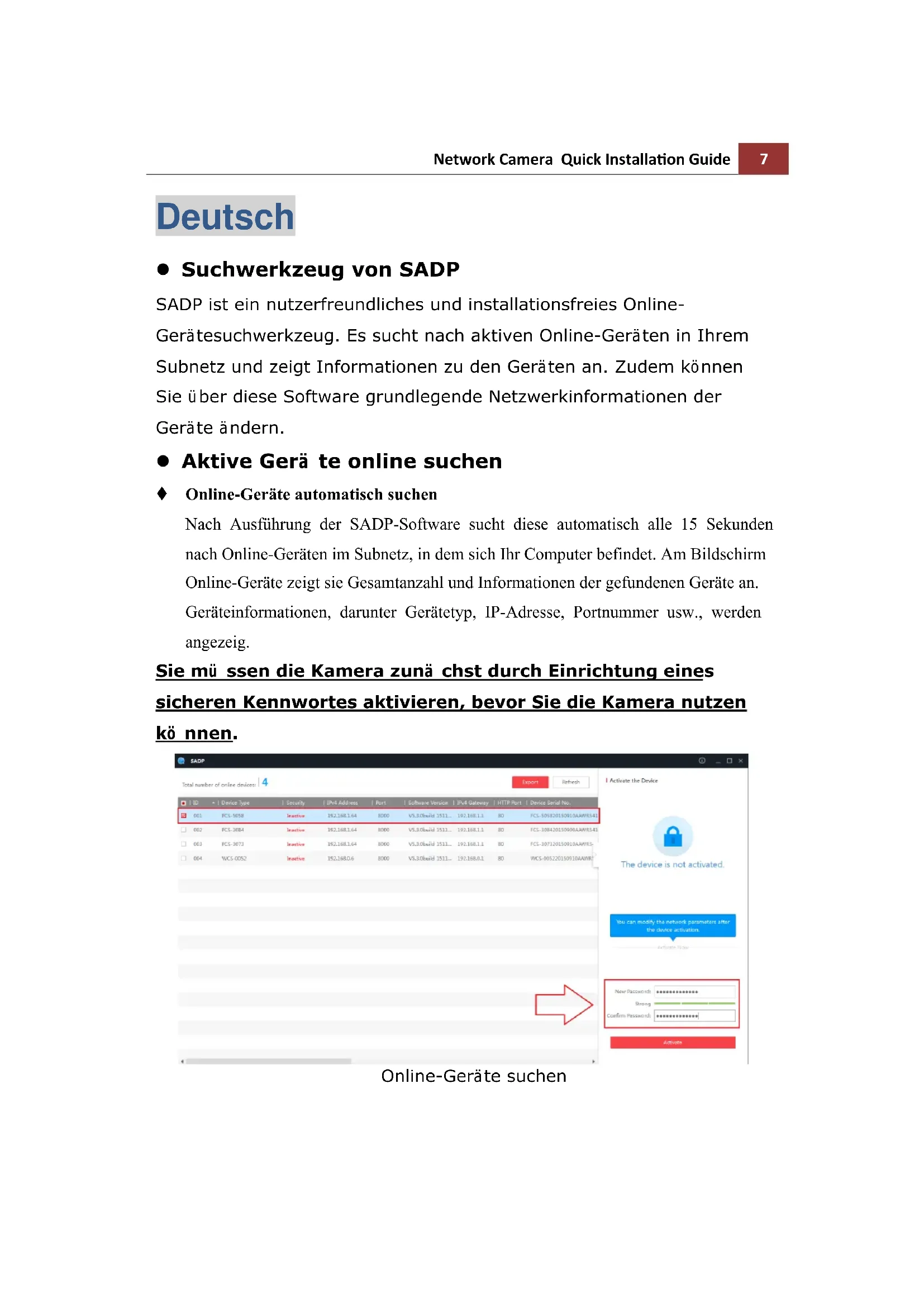Deutsch Suchwerkzeug von SADP SADP ist ein nutzerfreundliches und installationsfreies Online- Gerätesuchwerkzeug. Es sucht nach aktiven Online-Geräten in Ihrem Subnetz und zeigt Informationen zu den Geräten an. Zudem können Sie über diese Software grundlegende Netzwerkinformationen der Geräte ändern. Aktive Gerä te online suchen Online-Geräte automatisch suchen Nach Ausführung der SADP-Software sucht diese automatisch alle 15 Sekunden nach Online-Geräten im Subnetz, in dem sich Ihr Computer befindet. Am Bildschirm Online-Geräte zeigt sie Gesamtanzahl und Informationen der gefundenen Geräte an. Geräteinformationen, darunter Gerätetyp, IP-Adresse, Portnummer usw., werden angezeig. Sie mü ssen die Kamera zunä chst durch Einrichtung eines sicheren Kennwortes aktivieren, bevor Sie die Kamera nutzen kö nnen. Online-Geräte suchen8 Network Camera Quick Installation Guide