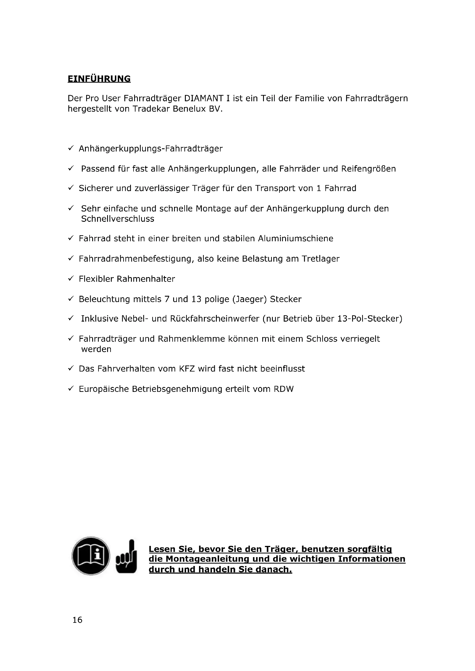 Ø2615 EXPLOSIETEKENING16 EINFÜHRUNG Der Pro User Fahrradträger DIAMANT I ist ein Teil der Familie von Fahrradträgern hergestellt von Tradekar Benelux BV.