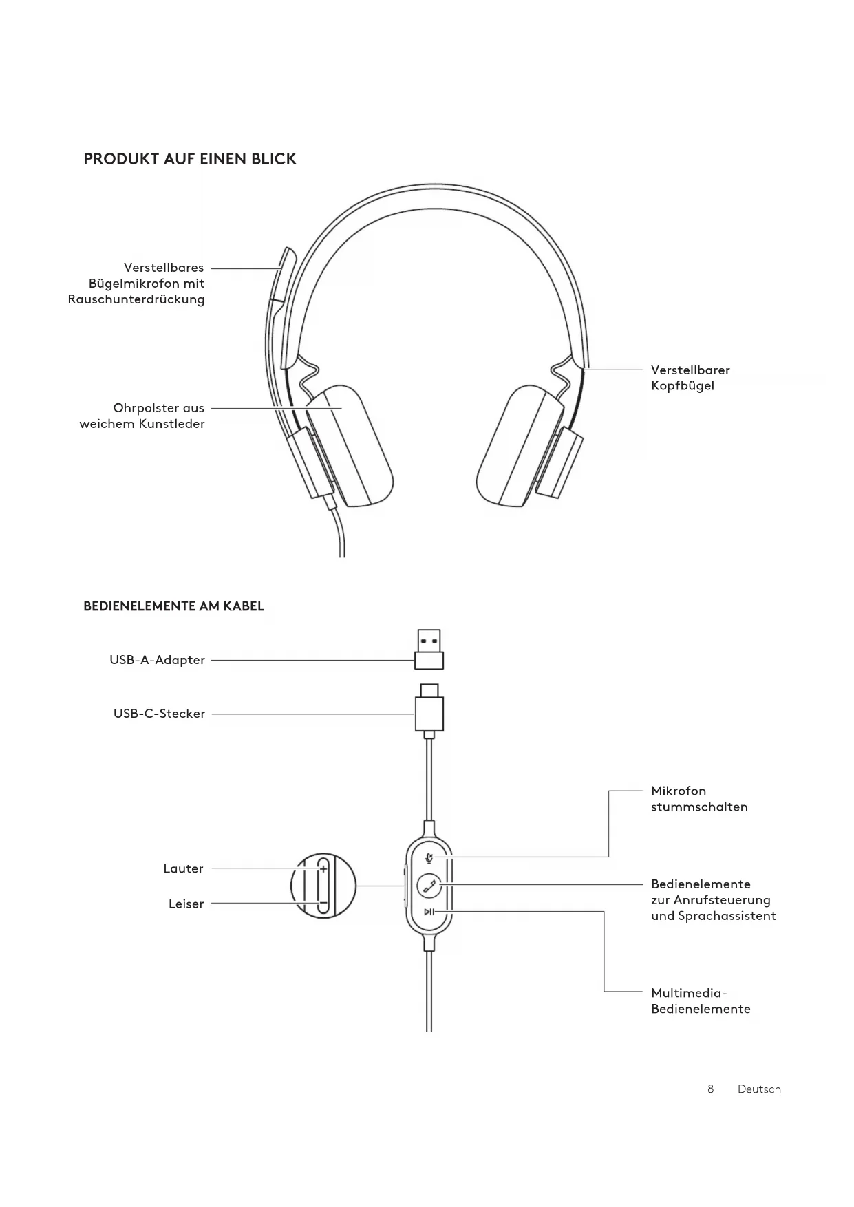 Mikrofon stummschalten Bedienelemente zurAnrufsteuerung und Sprachassistent Lauter Leiser USB-C-Stecker USB-A-Adapter Multimedia- Bedienelemente 8 DeutschUSB-A USB-C INHALT