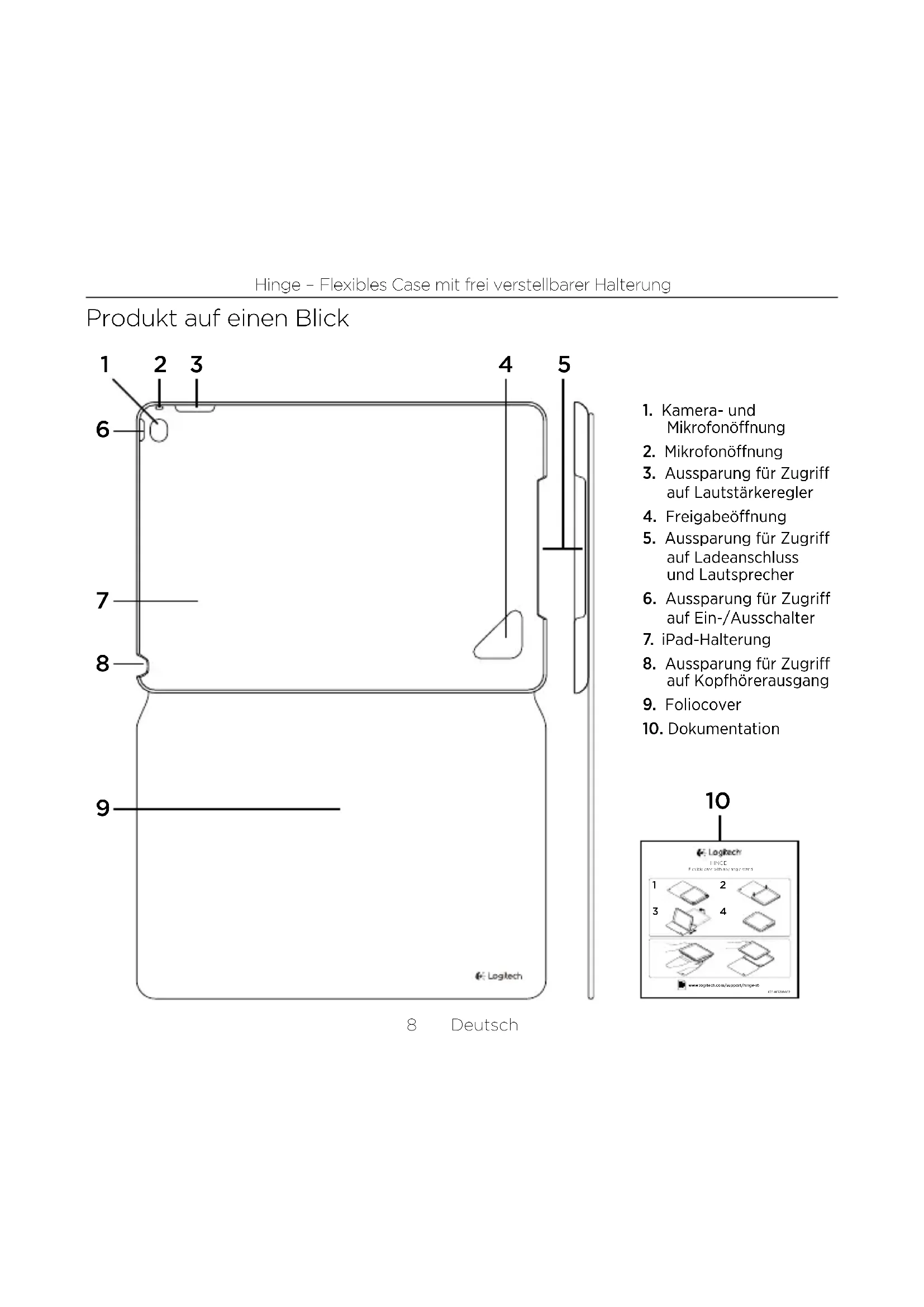 - Vergewissern Sie sich, dass Ihr iPad richtig herum in der Halterung sitzt. Bei richtiger Befestigung passt die Kamera Ihres iPads genau durch die Kameraönung der Halterung. Ihre Meinung ist gefragt. Bitte nehmen Sie sich etwas Zeit, um einige Fragen zu beantworten. Vielen Dank, dass Sie sich für unser Produkt entschieden haben. www.logitech.com/ithinkFrançais 13 Hinge - Étui flexible avec support multi-angle Présentation du produit
