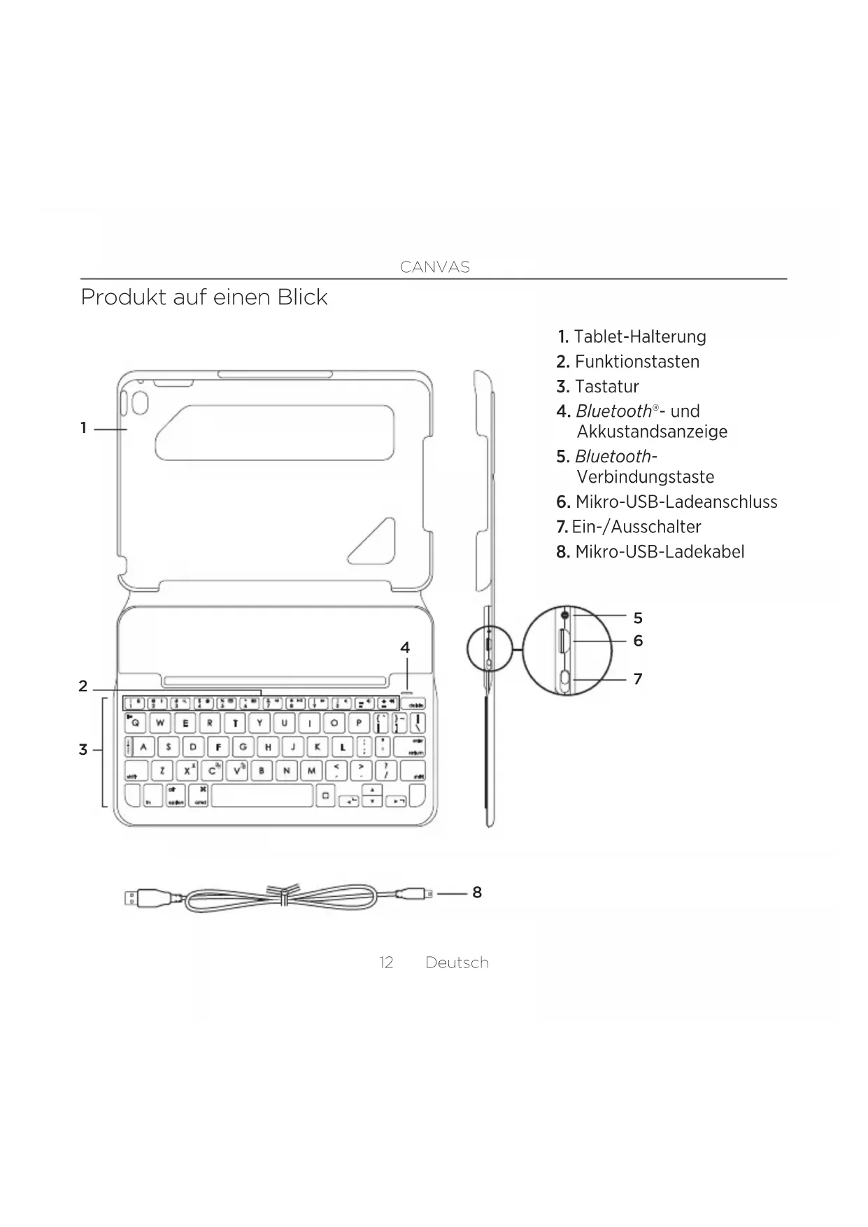 17 Deutsch Statusanzeigen Die Statusanzeige Ihres Tastatur-Case bietet Informationen zum Akkustand der Tastatur und zur Bluetooth-Verbindung: LED Beschreibung Grün Der Akku ist ausreichend geladen. Rot Der Akkustand ist niedrig (weniger als 10%). Laden Sie den Akku auf. Blinkt blau Schnell: Die Tastatur ist im Erkennungsmodus und wartet auf dasPairing. Langsam: Die Tastatur versucht, erneut eine Verbindung mit Ihrem iPad herzustellen. Leuchtet dauerhaft blau Das Bluetooth-Pairing bzw. die Wiederverbindung war erfolgreich.CANVAS 18 Deutsch Funktionstasten Fn + 1 = Bildschirm sperren Sperrt oder entsperrt den Bildschirm des iPad mini Fn + 2 = Siri Sie können mit Ihrer Stimme Nachrichtensenden, Termineplanen, Telefonnummernwählen und mehr Fn + 3 = Suchen Startet die Suchfunktion desiPadmini Fn + 4 = Sprache ändern Ändert die Tastatursprache Fn + 5 = Virtuelle Tastatur Zeigt die virtuelle Tastatur an oder blendet sie aus Fn + 6 = Screenshot Fn + 7 = Vorheriger Titel Fn + 8 = Wiedergabe/Pause Fn + 9 = Nächster Titel Fn + 0 = Stummschalten Fn + Minus = Leiser Fn + Plus = Lauter Home = Startbildschirm desiPadmini Zeigt den Startbildschirm desiPadmini an Fn + X = Ausschneiden Fn + C = Kopieren Fn + V = Einfügen Fn + Pfeiltaste nach links = Auswählen links Wählt den Text auf der linken Seite Wort für Wort aus Fn + Pfeiltaste nach rechts = Auswählen rechts Wählt den Text auf der rechten Seite Wort für Wort aus Fn + Leertaste = Zwischen Anwendungen wechseln Hinweis: Um eine Funktionstaste auszuwählen, halten Sie die Fn-Taste gedrückt und drücken Sie dieoben angegebene Taste.CANVAS 19 Deutsch Laden des Tastaturakkus Wenn die Statusanzeige für den Akku rotleuchtet, muss der Akku des Keyboard- Case geladen werden.