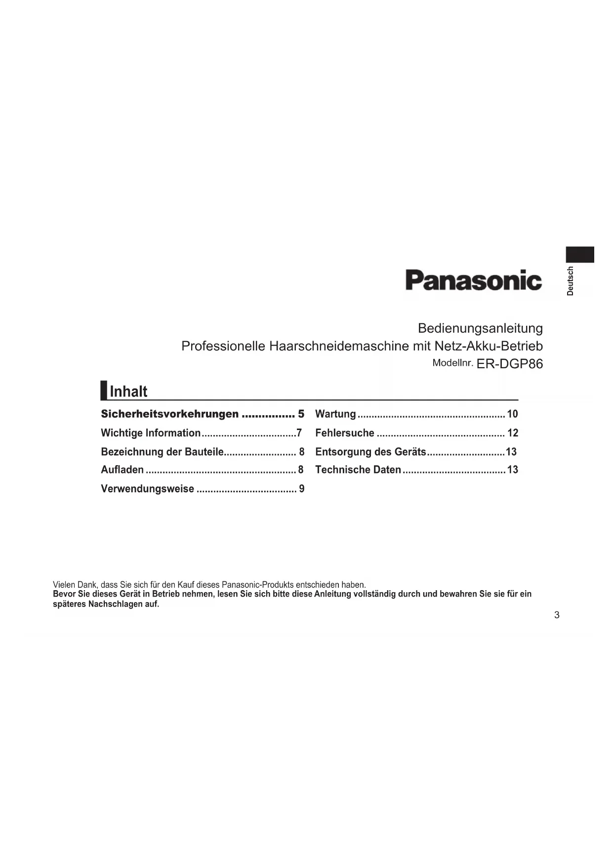 - Operating Instructions AC/Rechargeable Professional Hair Clipper Model No. ER‑DGP86 Deutsch 3 Français 15 Italiano 2723 Deutsch Bedienungsanleitung Professionelle Haarschneidemaschine mit Netz‑Akku‑Betrieb Modellnr. ER‑DGP86 Vielen Dank, dass Sie sich für den Kauf dieses Panasonic‑Produkts entschieden haben. Bevor Sie dieses Gerät in Betrieb nehmen, lesen Sie sich bitte diese Anleitung vollständig durch und bewahren Sie sie für ein späteres Nachschlagen auf. Sicherheitsvorkehrungen 5 Wichtige Information p. 7