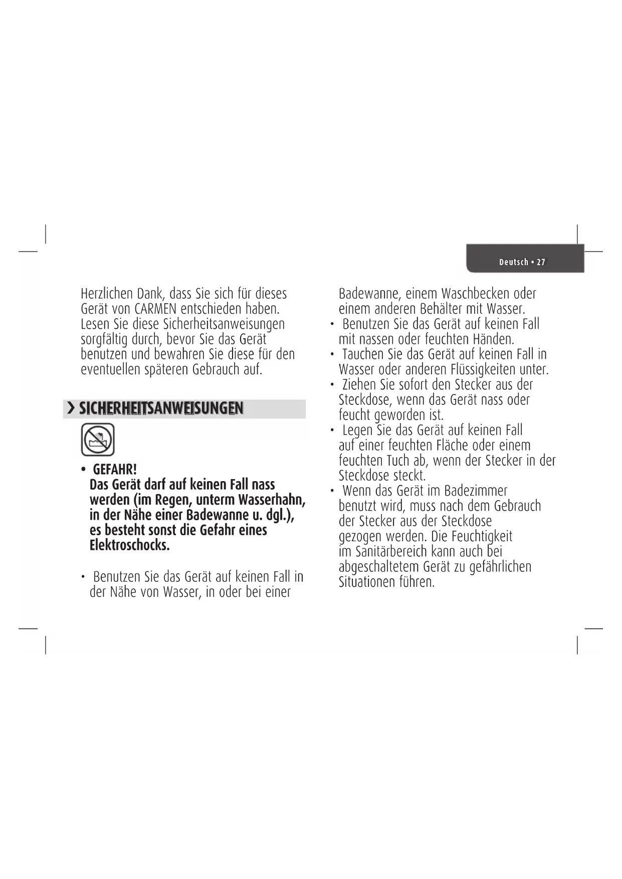 - Délai de garantie dépassé.Deutsch • 27 Herzlichen Dank, dass Sie sich für dieses Gerät von CARMEN entschieden haben. Lesen Sie diese Sicherheitsanweisungen sorgfältig durch, bevor Sie das Gerät benutzen und bewahren Sie diese für den eventuellen späteren Gebrauch auf. › SICHERHEITSANWEISUNGEN