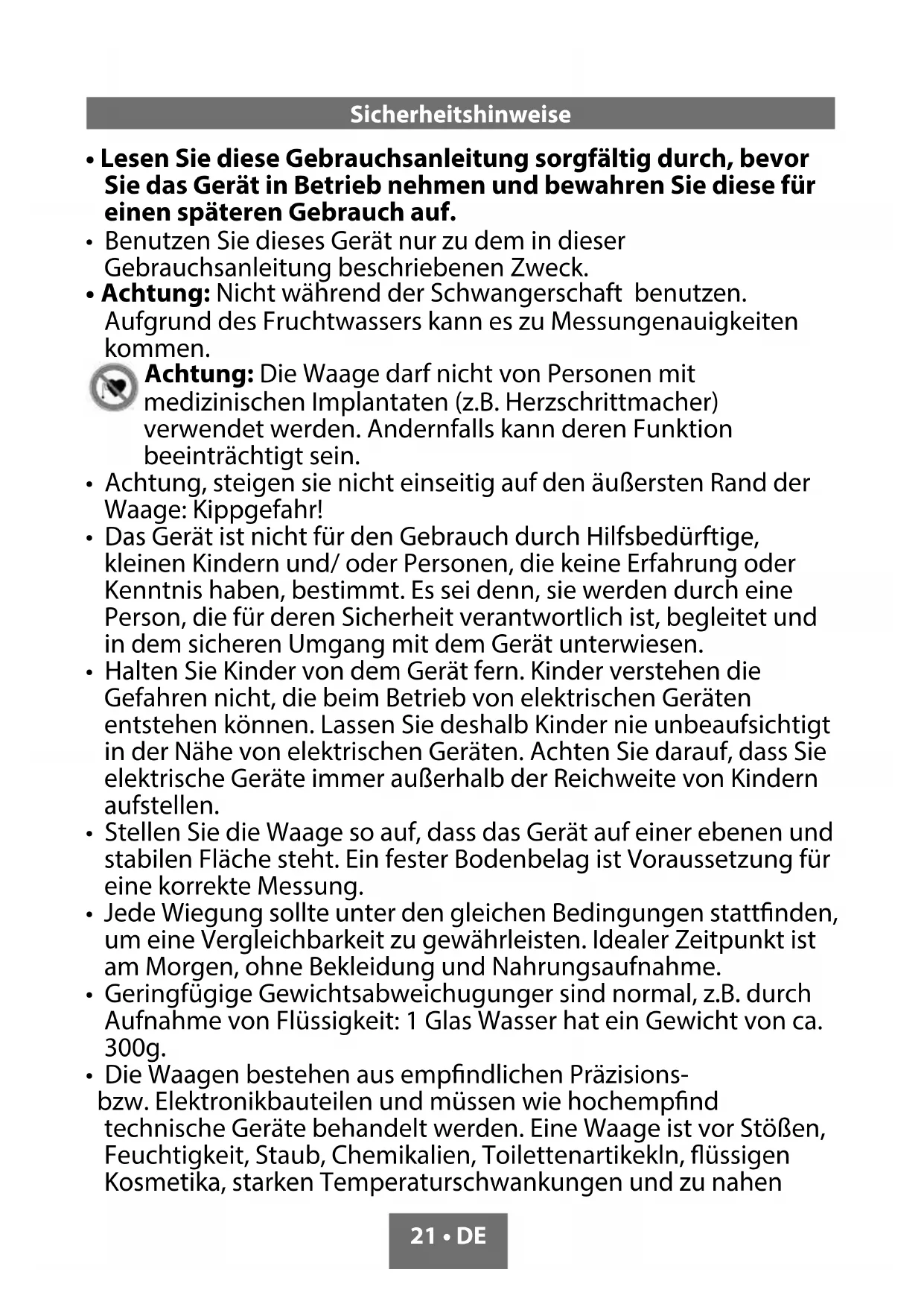 Achtung: Die Waage darf nicht von Personen mit medizinischen Implantaten (z.B. Herzschrittmacher) verwendet werden. Andernfalls kann deren Funktion beeinträchtigt sein.