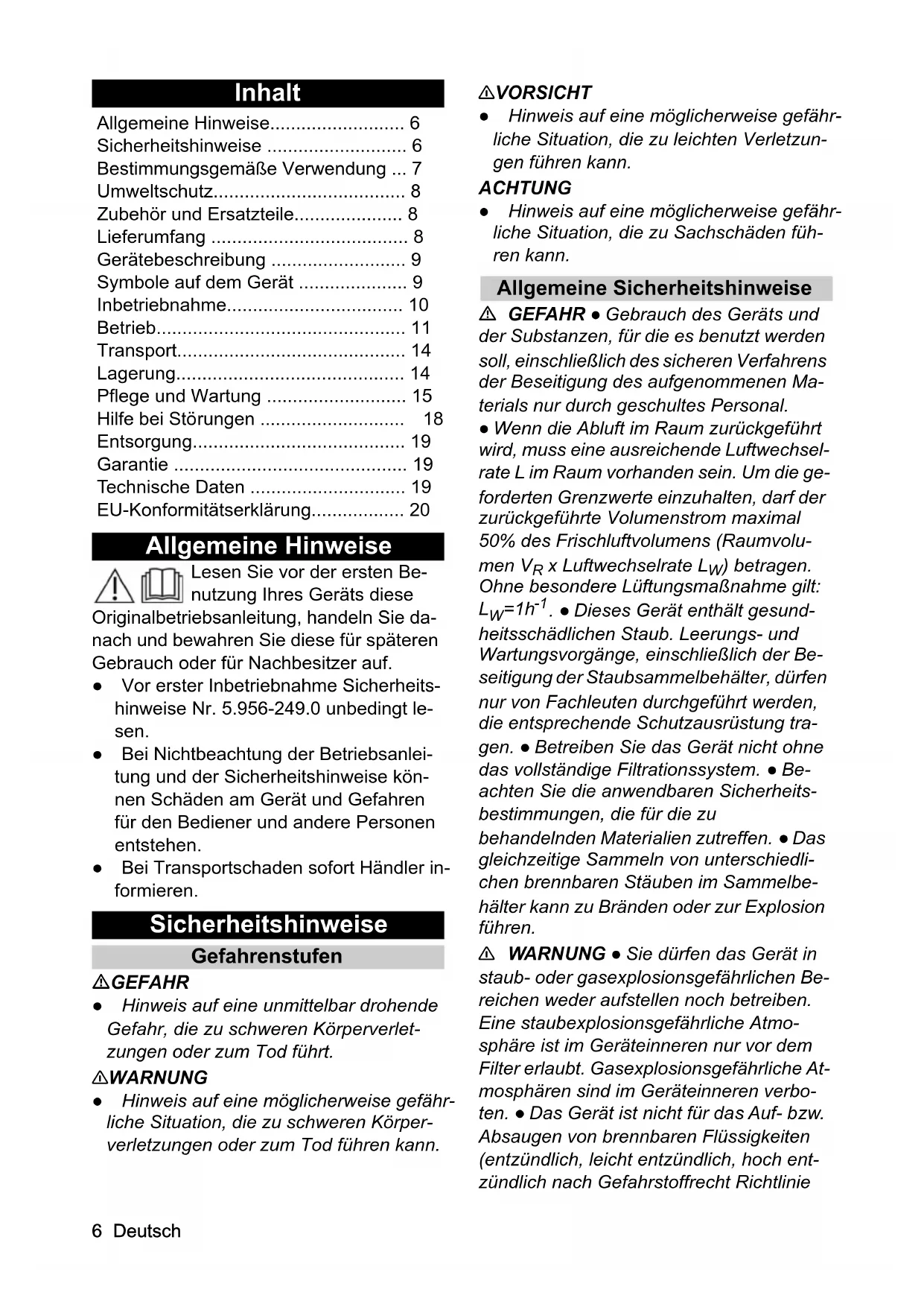 WARNUNG • Sie dürfen das Gerät in staub- oder gasexplosionsgefährlichen Bereichen weder aufstellen noch betreiben. Eine staubexplosionsgefährliche Atmosphere ist im Geräteinneren nur vor dem Filter erlaubt. Gasexplosionsgefährliche Atmosphere sind im Geräteinneren verboten. • Das Gerät ist nicht für das Auf- bzw. Absaugen von brennbaren Flüssigkeiten (entzündlich, weniger entzündlich, hoch entzündlich nach Gefahrstoffrecht Richtlinie