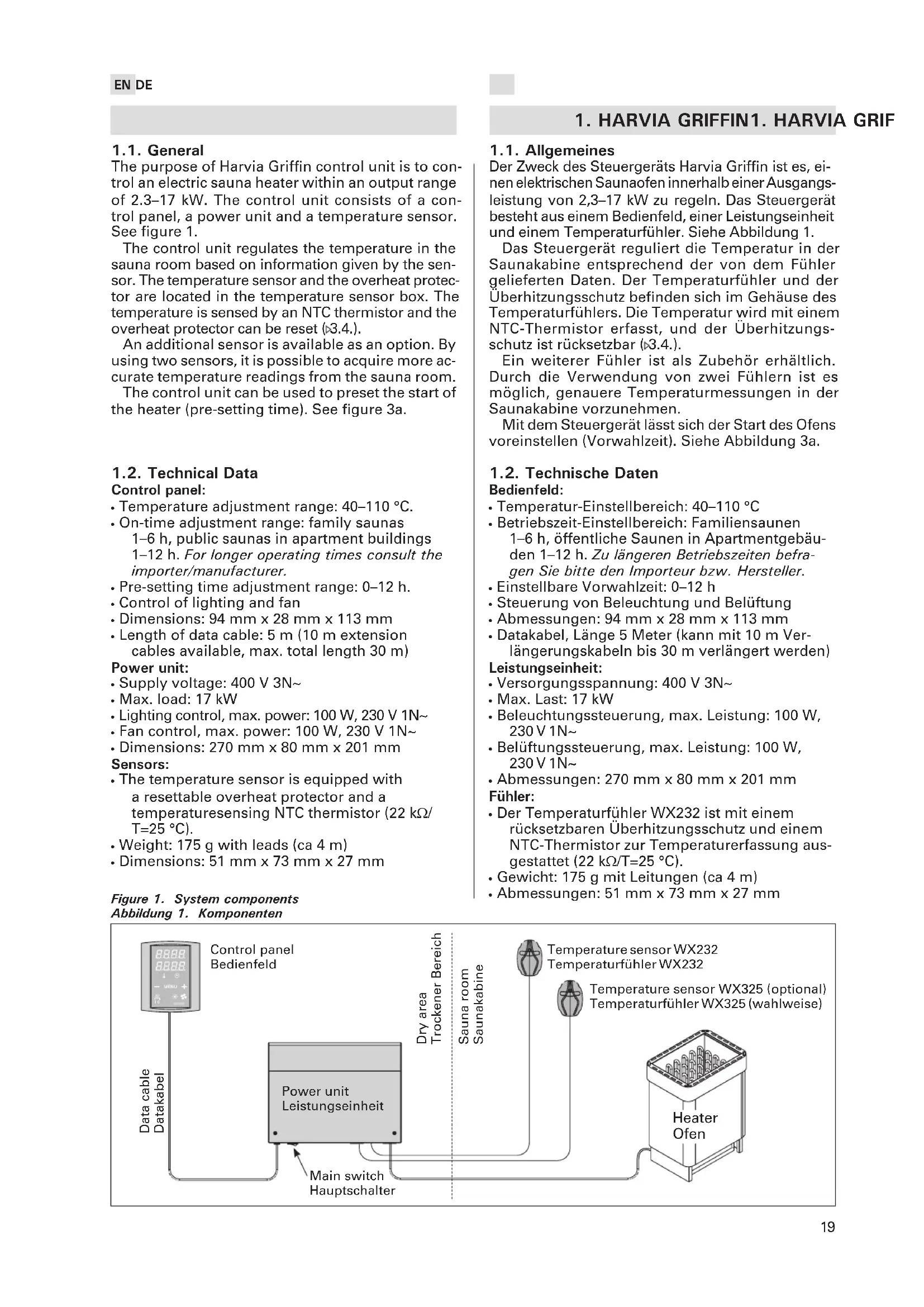 - Dimensions: 51 mm x 73 mm x 27 mm Figure 1. System components Abbildung 1. Komponenten Temperature sensor WX232 Temperaturfühler WX232 Heater Ofen Control panel Bedienfeld Power unit Leistungseinheit Sauna room Saunakabine Dry area Trockener Bereich Temperature sensor WX325 (optional) Temperaturfühler WX325 (wahlweise) Main switch Hauptschalter 1.1. Allgemeines Der Zweck des Steuergeräts Harvia Grifn ist es, ei- nen elektrischen Saunaofen innerhalb einer Ausgangs- leistung von 2,3–17 kW zu regeln. Das Steuergerät besteht aus einem Bedienfeld, einer Leistungseinheit und einem Temperaturfühler. Siehe Abbildung 1. Das Steuergerät reguliert die Temperatur in der Saunakabine entsprechend der von dem Fühler gelieferten Daten. Der Temperaturfühler und der Überhitzungsschutz benden sich im Gehäuse des Temperaturfühlers. Die Temperatur wird mit einem NTC-Thermistor erfasst, und der Überhitzungs- schutz ist rücksetzbar ( 3.4.). Ein weiterer Fühler ist als Zubehör erhältlich. Durch die Verwendung von zwei Fühlern ist es möglich, genauere Temperaturmessungen in der Saunakabine vorzunehmen. Mit dem Steuergerät lässt sich der Start des Ofens voreinstellen (Vorwahlzeit). Siehe Abbildung 3a. 1.2. Technische Daten Bedienfeld: