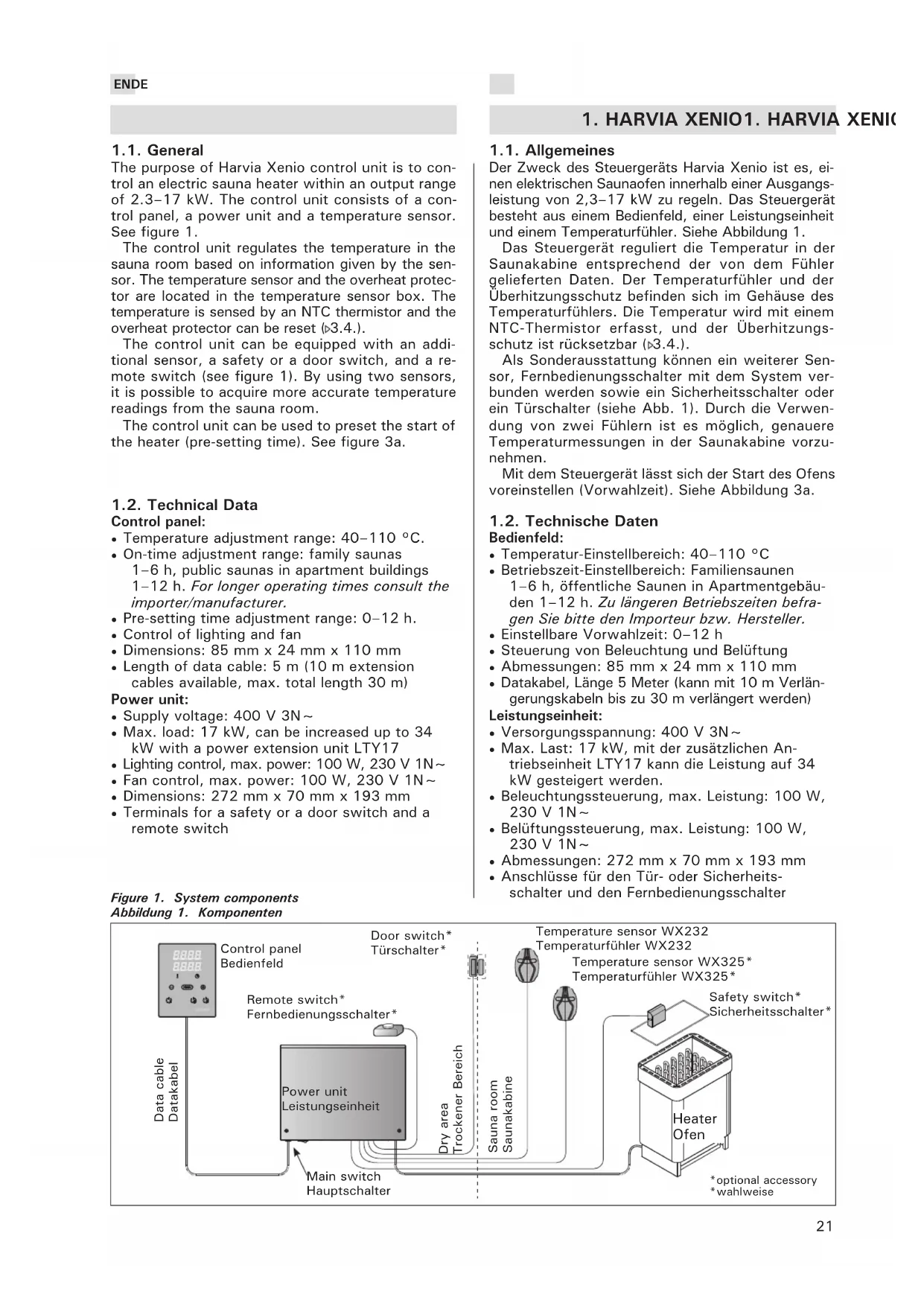 - Lighting control, max. power: 100 W, 230 V 1N~• Fan control, max. power: 100 W, 230 V 1N~• Dimensions: 272 mm x 70 mm x 193 mm• Terminals for a safety or a door switch and a remote switch Figure 1. System components Abbildung 1. Komponenten Temperature sensor WX232 Temperaturfühler WX232 Heater Ofen Control panel Bedienfeld Power unit Leistungseinheit Sauna room Saunakabine Remote switch* Fernbedienungsschalter* Door switch* Türschalter* Safety switch* Sicherheitsschalter* *optional accessory *wahlweise Dry area Trockener Bereich Temperature sensor WX325* Temperaturfühler WX325* Main switch Hauptschalter 1.1. Allgemeines Der Zweck des Steuergeräts Harvia Xenio ist es, ei- nen elektrischen Saunaofen innerhalb einer Ausgangs- leistung von 2,3–17 kW zu regeln. Das Steuergerät besteht aus einem Bedienfeld, einer Leistungseinheit und einem Temperaturfühler. Siehe Abbildung 1. Das Steuergerät reguliert die Temperatur in der Saunakabine entsprechend der von dem Fühler gelieferten Daten. Der Temperaturfühler und der Überhitzungsschutz befinden sich im Gehäuse des Temperaturfühlers. Die Temperatur wird mit einem NTC-Thermistor erfasst, und der Überhitzungs- schutz ist rücksetzbar (