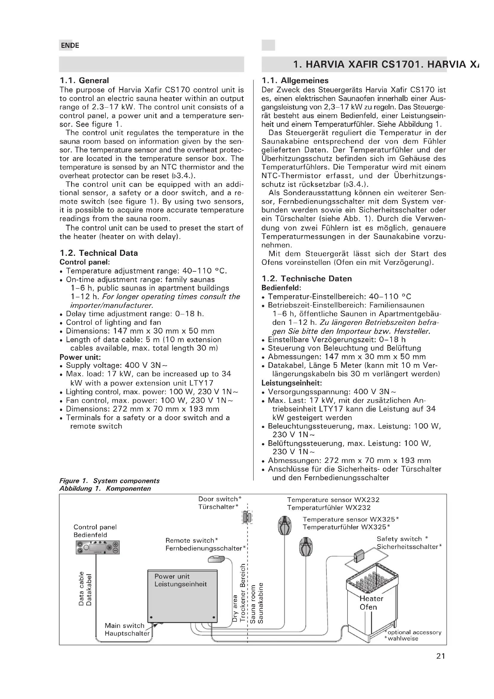 - Lighting control, max. power: 100 W, 230 V 1N~• Fan control, max. power: 100 W, 230 V 1N~• Dimensions: 272 mm x 70 mm x 193 mm• Terminals for a safety or a door switch and a remote switch Figure 1. System components Abbildung 1. Komponenten Temperature sensor WX232 Temperaturfühler WX232 Heater Ofen Control panel Bedienfeld Power unit Leistungseinheit Sauna room Saunakabine Dry area Trockener Bereich Temperature sensor WX325* Temperaturfühler WX325* Main switch Hauptschalter 1.1. Allgemeines Der Zweck des Steuergeräts Harvia Xafir CS170 ist es, einen elektrischen Saunaofen innerhalb einer Aus- gangsleistung von 2,3–17 kW zu regeln. Das Steuerge- rät besteht aus einem Bedienfeld, einer Leistungsein- heit und einem Temperaturfühler. Siehe Abbildung 1. Das Steuergerät reguliert die Temperatur in der Saunakabine entsprechend der von dem Fühler gelieferten Daten. Der Temperaturfühler und der Überhitzungsschutz befinden sich im Gehäuse des Temperaturfühlers. Die Temperatur wird mit einem NTC-Thermistor erfasst, und der Überhitzungs- schutz ist rücksetzbar (