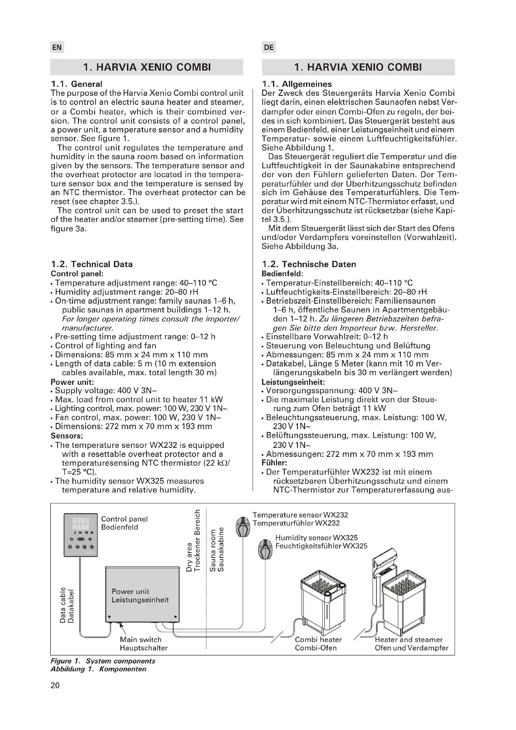 - 4. RESERVDELAR These instructions for installation and use are intended for owners of saunas, heaters and control units, persons in charge of managing saunas, heaters and control units, and for electricians responsible for installing heaters and control units. Once the control unit is installed, these instructions of installation and use are handed over to the owner of the sauna, heater and control unit, or to the person in charge of maintaining them. CONTROL UNIT HARVIA XENIO COMBI (CX110C) Control unit's purpose of use: the control unit is meant for controlling the functions of a sauna heater and/or steamer. It is not to be used for any other purpose. Congratulations on making an excellent choice! Diese Montage- und Gebrauchsanleitung richtet sich an Besitzer von Saunen, Öfen und Steuergerä- ten, an Personen, die für den Betrieb von Saunen, Öfen und Steuergeräten verantwortlich sind, sowie an Elektromonteure, die mit der Montage von Sau- naöfen und Steuergeräten betraut sind. Nach der Montage des Steuergeräts ist diese Montage- und Gebrauchsanleitung dem Besitzer der Sauna, des Ofens bzw. des Steuergeräts oder der für die War- tung der Anlagen zuständigen Person auszuhändi- gen. STEUERGERÄT HARVIA XENIO COMBI (CX110C) Verwendungszweck des Steuergeräts: Das Steuergerät dient zur Steuerung der Funktionen eines Saunaofens und/oder Verdampfers. Er darf nicht für andere Zwecke verwendet werden. Wir beglückwünschen Sie zu Ihrer guten Wahl! CONTENTS p. 19