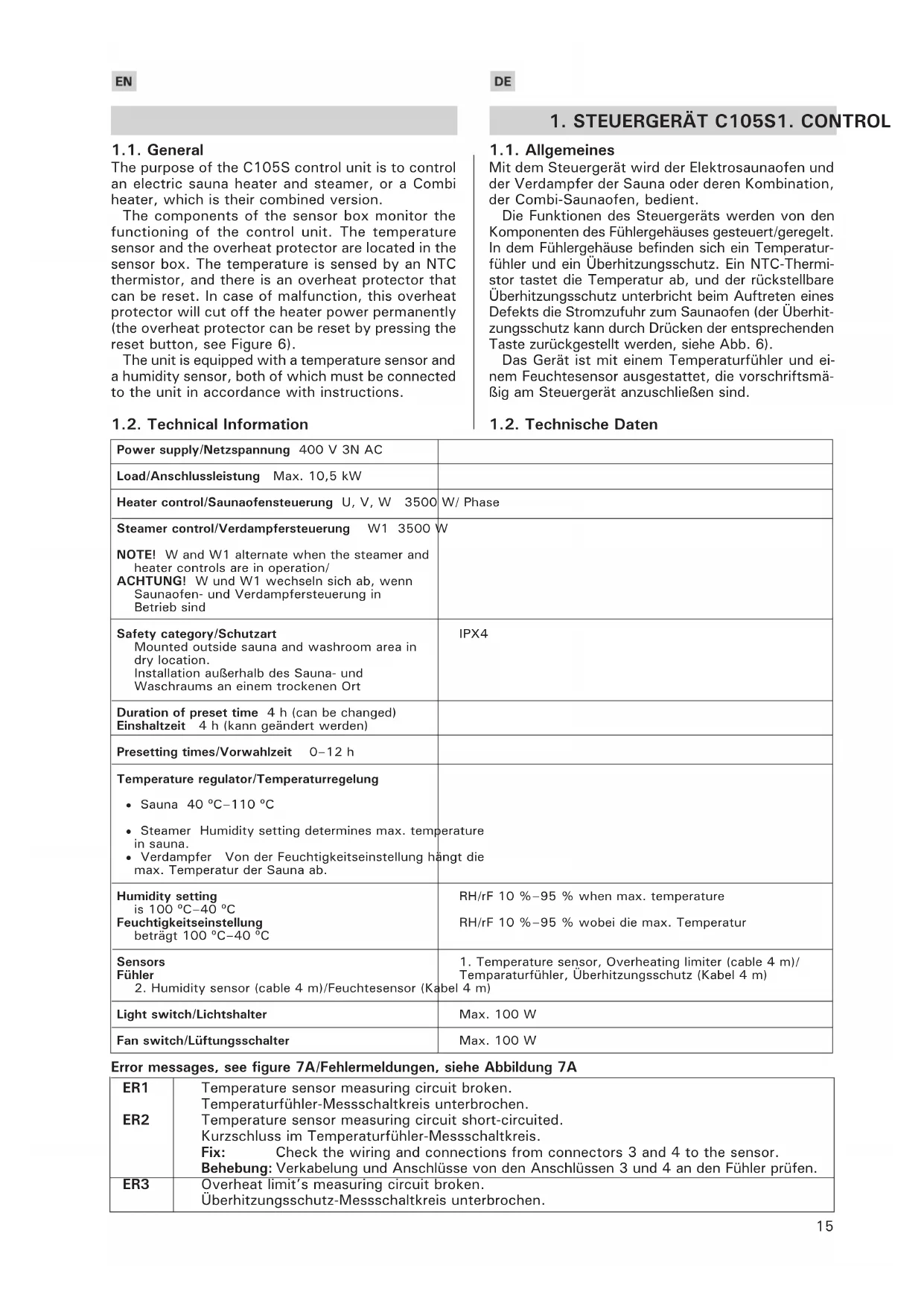 1.1. Allgemeines Mit dem Steuergerät wird der Elektrosaunaofen und der Verdampfer der Sauna oder deren Kombination, der Combi-Saunaofen, bedient. Die Funktionen des Steuergeräts werden von den Komponenten des Fühlergehäuses gesteuert/geregelt. In dem Fühlergehäuse befinden sich ein Temperatur- fühler und ein Überhitzungsschutz. Ein NTC-Thermi- stor tastet die Temperatur ab, und der rückstellbare Überhitzungsschutz unterbricht beim Auftreten eines Defekts die Stromzufuhr zum Saunaofen (der Überhit- zungsschutz kann durch Drücken der entsprechenden Taste zurückgestellt werden, siehe Abb. 6). Das Gerät ist mit einem Temperaturfühler und ei- nem Feuchtesensor ausgestattet, die vorschriftsmä- ßig am Steuergerät anzuschließen sind. 1.2. Technische Daten 1.1. General The purpose of the C105S control unit is to control an electric sauna heater and steamer, or a Combi heater, which is their combined version. The components of the sensor box monitor the functioning of the control unit. The temperature sensor and the overheat protector are located in the sensor box. The temperature is sensed by an NTC thermistor, and there is an overheat protector that can be reset. In case of malfunction, this overheat protector will cut off the heater power permanently (the overheat protector can be reset by pressing the reset button, see Figure 6). The unit is equipped with a temperature sensor and a humidity sensor, both of which must be connected to the unit in accordance with instructions. 1.2. Technical Information Power supply/Netzspannung 400 V 3N AC Load/Anschlussleistung Max. 10,5 kW Heater control/Saunaofensteuerung U, V, W 3500 W/ Phase Steamer control/Verdampfersteuerung W1 3500 W NOTE! W and W1 alternate when the steamer and heater controls are in operation/ ACHTUNG! W und W1 wechseln sich ab, wenn Saunaofen- und Verdampfersteuerung in Betrieb sind Safety category/Schutzart IPX4 Mounted outside sauna and washroom area in dry location. Installation außerhalb des Sauna- und Waschraums an einem trockenen Ort Duration of preset time 4 h (can be changed) Einshaltzeit 4 h (kann geändert werden) Presetting times/Vorwahlzeit 0–12 h Temperature regulator/Temperaturregelung