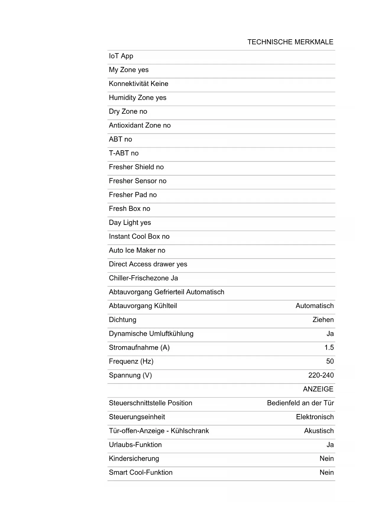 Kühlschränke HFR7720DWMP ENVIRONMENTAL PROPERTIES OR CHARACTERISTICS Product recyclability Recycled material in the product Rare earths in the product, contains at least (mg) Precious metals in the product, contains at least (mg) Recycled material in the packaging 0 Possibility of reusing packaging Nein WICHTIGSTE MERKMALE Produktname/Handelscode HFR7720DWMP Produktcode 34005192 EAN-Code 6901018081729 Installation Freistehend Produktkategorie Kühl-Gefrierkombination Produkttyp 4 Türen Kühltechnik No Frost Anzeige JaTECHNISCHE MERKMALE IoT App My Zone yes Konnektivität Keine Humidity Zone yes Dry Zone no Antioxidant Zone no ABT no T-ABT no Fresher Shield no Fresher Sensor no Fresher Pad no Fresh Box no Day Light yes Instant Cool Box no Auto Ice Maker no Direct Access drawer yes Chiller-Frischezone Ja Abtauvorgang Gefrierteil Automatisch Abtauvorgang Kühlteil Automatisch Dichtung Ziehen Dynamische Umluftkühlung Ja Stromaufnahme (A) 1.5 Frequenz (Hz) 50 Spannung (V) 220-240 ANZEIGE Steuerschnittstelle Position Bedienfeld an der Tür Steuerungseinheit Elektronisch Tür-offen-Anzeige - Kühlschrank Akustisch Urlaubs-Funktion Ja Kindersicherung Nein Smart Cool-Funktion NeinSchnell-Kühl-Funktion Ja Super Gefrierfunktion Ja Temperatur verstellbar Kühl-Gefrierkombination AESTHETIK Farbe/Material des Produkts Platinum Inox Türablagen Chromleisten Türablagen Material Kristallklares Plastik Flaschenhalter Klappbares Weinregal Teleskopschienen Nein Griffe Komfortabler integrierter Griff Eisspender Nein Licht LED Anzahl der Gemüseschubladen 1 Anzahl der Eierregale 2x transparent Anzahl der Eisschächte 1x transparent Wechselbarer Türanschlag Nein Regalaufmachung Silberleisten Flaschenregale Nein Gesamtzahl der Türfächer 6 Türanschlag - Anzahl der Gefrierschubladen 2 Innenventilator Kühlteil Ja Material der Regale Glas Anzahl verstellbarer Ablagen im Kühlteil