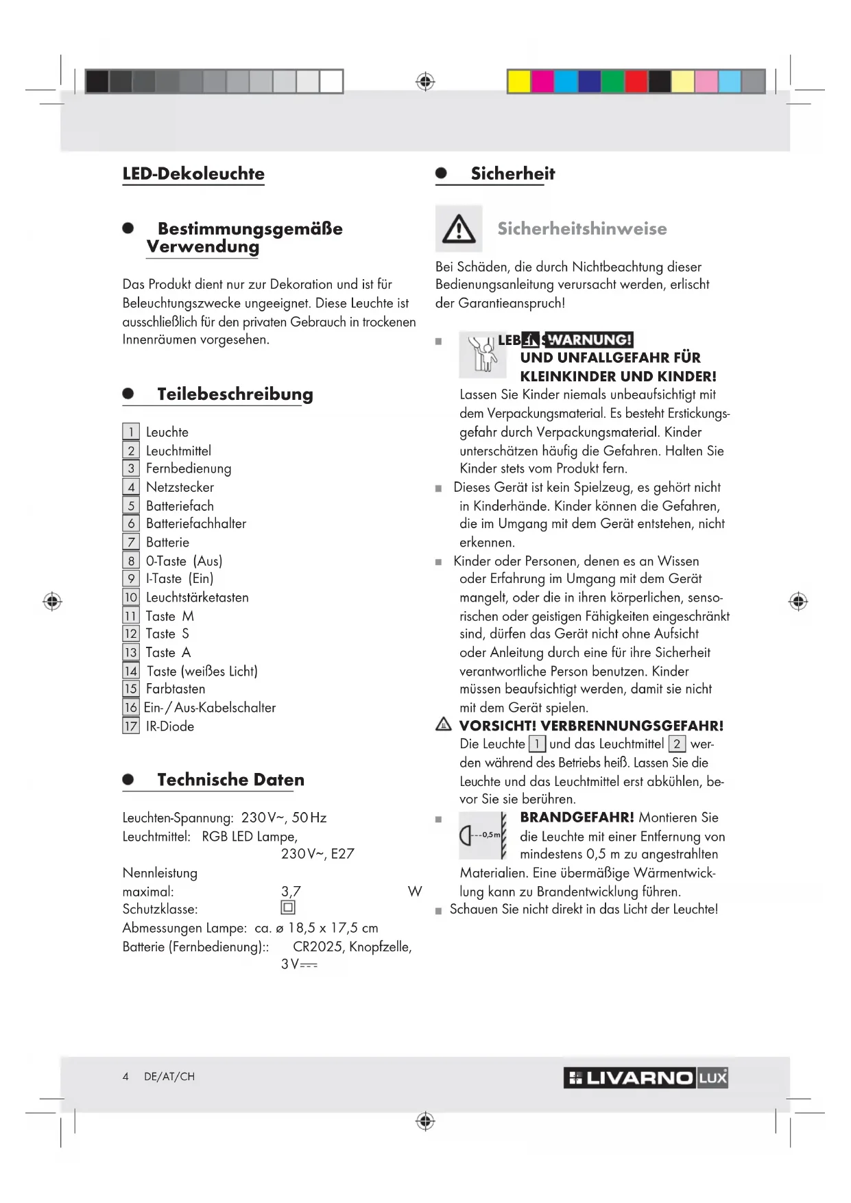 IR-Diode Technische Daten Leuchten-Spannung: 230 V∼, 50 Hz Leuchtmittel: RGB LED Lampe, 230 V∼, E27 Nennleistung maximal: 3,7 W Schutzklasse: Abmessungen Lampe: ca. ø 18,5 x 17,5 cm Batterie (Fernbedienung):: CR2025, Knopfzelle, 3 V Sicherheit Sicherheitshinweise Bei Schäden, die durch Nichtbeachtung dieser Bedienungsanleitung verursacht werden, erlischt der Garantieanspruch! LEBENS-