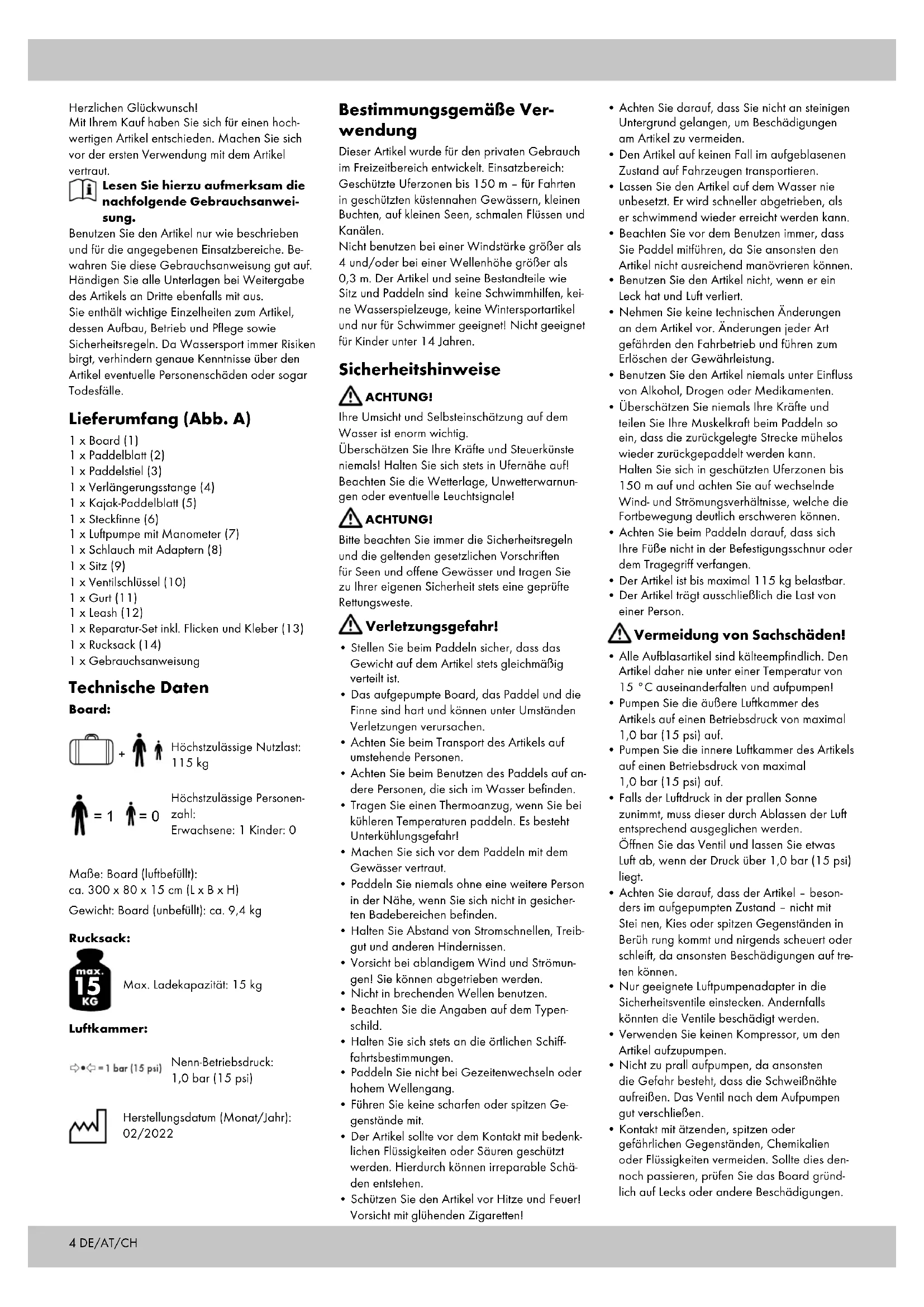 Max. Ladekapazität: 15 kg Luftkammer: Nenn-Betriebsdruck: 1,0 bar (15 psi) Herstellungsdatum (Monat/Jahr): 02/2022 Bestimmungsgemäße Ver- wendung Dieser Artikel wurde für den privaten Gebrauch im Freizeitbereich entwickelt. Einsatzbereich: Geschützte Uferzonen bis 150 m – für Fahrten in geschützten küstennahen Gewässern, kleinen Buchten, auf kleinen Seen, schmalen Flüssen und Kanälen. Nicht benutzen bei einer Windstärke größer als 4 und/oder bei einer Wellenhöhe größer als 0,3 m. Der Artikel und seine Bestandteile wie Sitz und Paddeln sind keine Schwimmhilfen, kei- ne Wasserspielzeuge, keine Wintersportartikel und nur für Schwimmer geeignet! Nicht geeignet für Kinder unter 14 Jahren. Sicherheitshinweise ACHTUNG! Ihre Umsicht und Selbsteinschätzung auf dem Wasser ist enorm wichtig. Überschätzen Sie Ihre Kräfte und Steuerkünste niemals! Halten Sie sich stets in Ufernähe auf! Beachten Sie die Wetterlage, Unwetterwarnun- gen oder eventuelle Leuchtsignale! ACHTUNG! Bitte beachten Sie immer die Sicherheitsregeln und die geltenden gesetzlichen Vorschriften für Seen und offene Gewässer und tragen Sie zu Ihrer eigenen Sicherheit stets eine geprüfte Rettungsweste. Verletzungsgefahr!