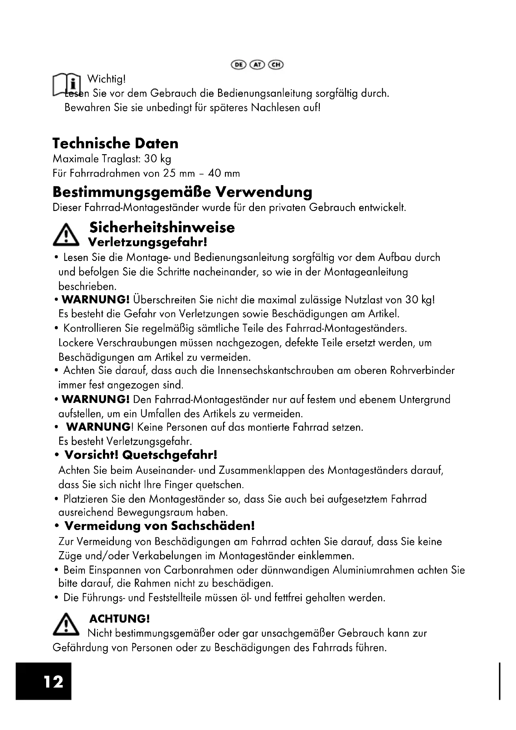 - WARNUNG! Den Fahrrad-Montageständer nur auf festem und ebenem Untergrund aufstellen, um ein Umfallen des Artikels zu vermeiden.