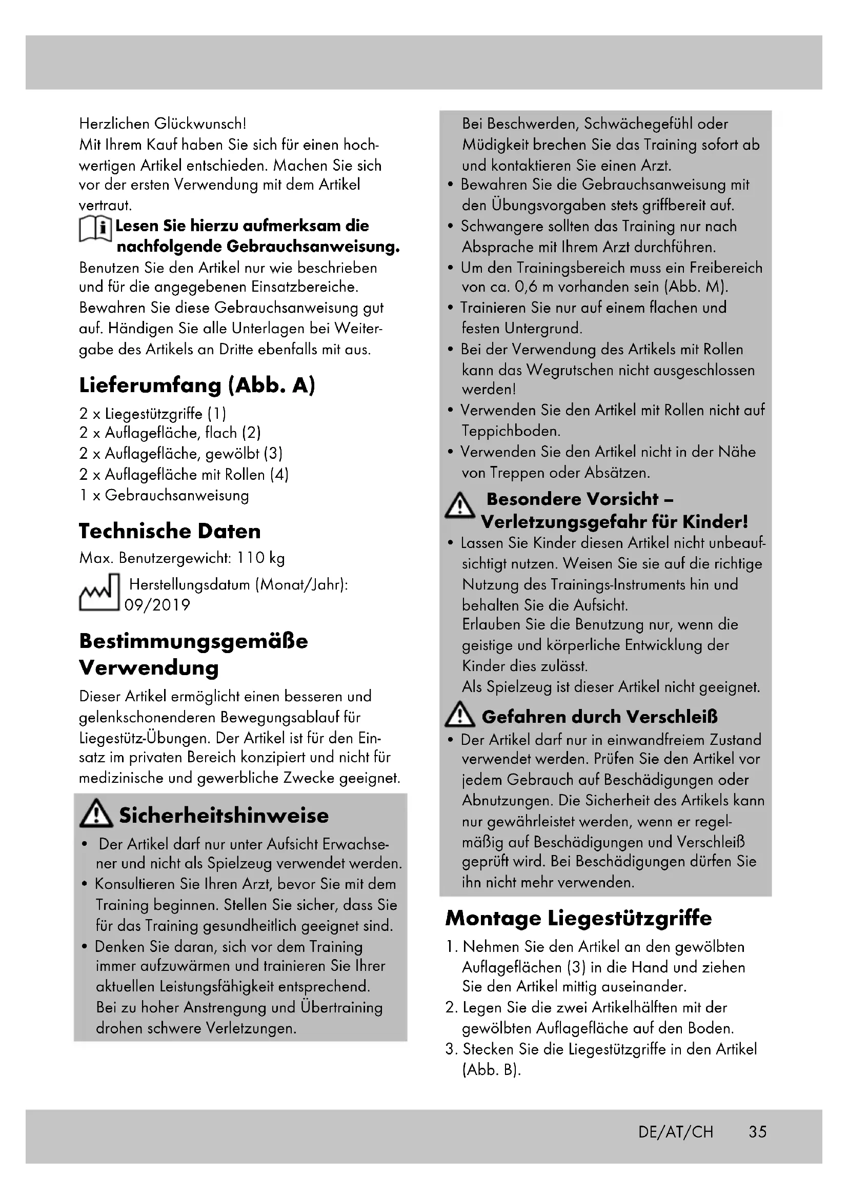 - Der Artikel darf nur in einwandfreiem Zustand verwendet werden. Prüfen Sie den Artikel vor jedem Gebrauch auf Beschädigungen oder Abnutzungen. Die Sicherheit des Artikels kann nur gewährleistet werden, wenn er regel- mäßig auf Beschädigungen und Verschleiß geprüft wird. Bei Beschädigungen dürfen Sie ihn nicht mehr verwenden. Montage Liegestützgriffe
