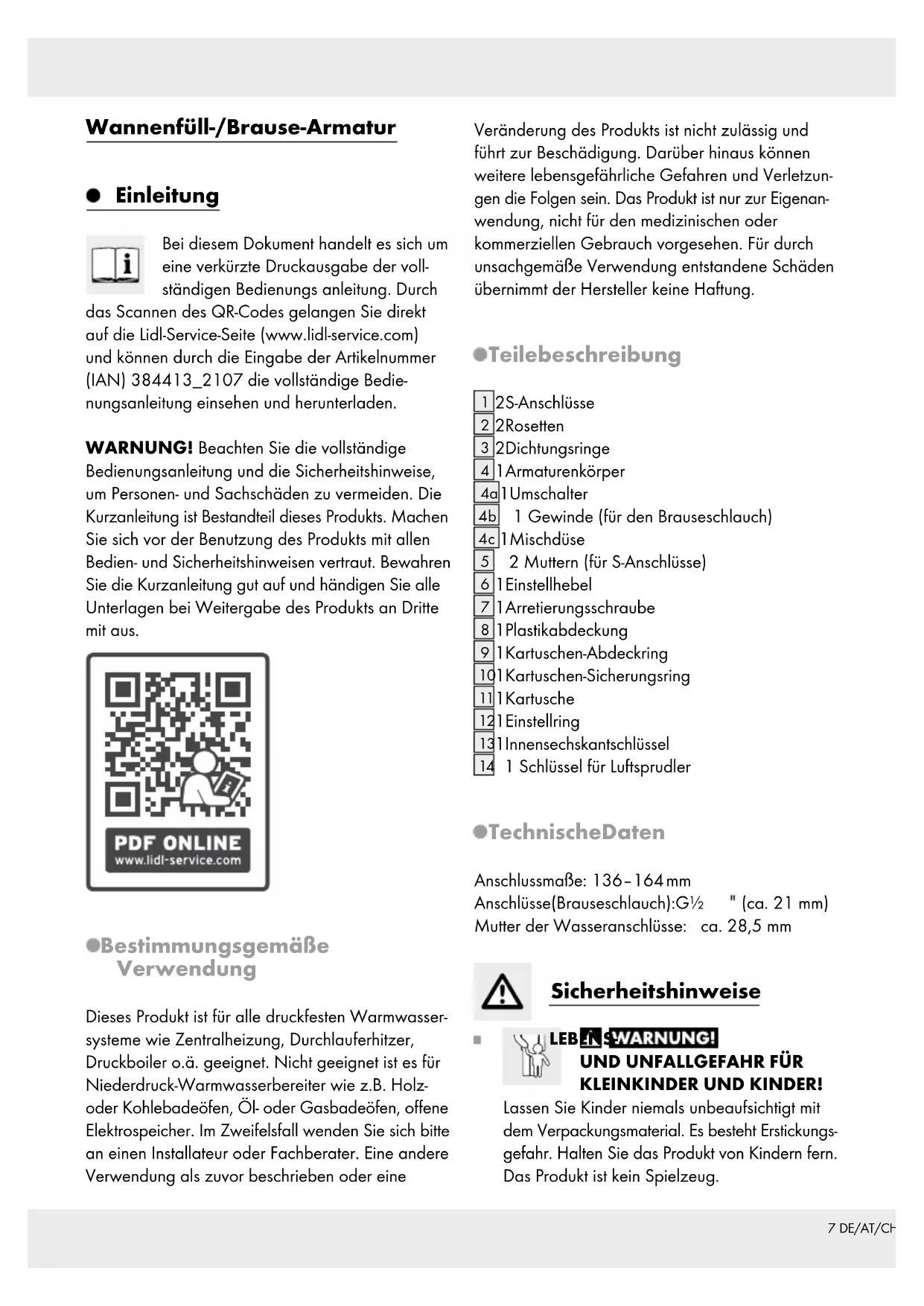 116 DE/AT/CH Einleitung ......................................................................................................................................... Seite 7 Bestimmungsgemäße Verwendung ....................................................................................................Seite 7 Teilebeschreibung ...............................................................................................................................Seite 7 Technische Daten ................................................................................................................................Seite 7 Sicherheitshinweise ................................................................................................................Seite 7 Montage ...........................................................................................................................................Seite 8 Armatur installieren .............................................................................................................................Seite 8 Armatur durchspülen ...........................................................................................................................Seite 8 Bedienung ......................................................................................................................................Seite 8 In Betrieb nehmen ...............................................................................................................................Seite 8 Umschalter Wassereinlauf Wanne / Duschbrause ...........................................................................Seite 9 Wasserspar-Funktion ...........................................................................................................................Seite 9 Temperaturbegrenzung einstellen ...................................................................................................... Seite 9 Wartung und Reinigung .....................................................................................................Seite 10 Armatur pflegen und reinigen ............................................................................................................Seite 10 Informationen .............................................................................................................................Seite 10 Trinkbarkeit von Leitungswasser ......................................................................................................... Seite 10 V1.07 DE/AT/CH Wannenfüll-/Brause-Armatur Einleitung Bei diesem Dokument handelt es sich um eine verkürzte Druckausgabe der voll- ständigen Bedienungs anleitung. Durch das Scannen des QR-Codes gelangen Sie direkt auf die Lidl-Service-Seite (www.lidl-service.com) und können durch die Eingabe der Artikelnummer (IAN) 384413_2107 die vollständige Bedie- nungsanleitung einsehen und herunterladen. WARNUNG! Beachten Sie die vollständige Bedienungsanleitung und die Sicherheitshinweise, um Personen- und Sachschäden zu vermeiden. Die Kurzanleitung ist Bestandteil dieses Produkts. Mac hen Sie sich vor der Benutzung des Produkts mit allen Bedien- und Sicherheitshinweisen vertraut. Bewahren Sie die Kurzanleitung gut auf und händigen Sie alle Unterlagen bei Weitergabe des Produkts an Dritte mit aus. Bestimmungsgemäße Verwendung Dieses Produkt ist für alle druckfesten Warmwasser- systeme wie Zentralheizung, Durchlauferhitzer, Druckboiler o.ä. geeignet. Nicht geeignet ist es für Niederdruck-Warmwasserbereiter wie z.B. Holz- oder Kohlebadeöfen, Öl- oder Gasbadeöfen, offene Elektrospeicher. Im Zweifelsfall wenden Sie sich bitte an einen Installateur oder Fachberater. Eine andere Verwendung als zuvor beschrieben oder eine Veränderung des Produkts ist nicht zulässig und führt zur Beschädigung. Darüber hinaus können weitere lebensgefährliche Gefahren und Verletzun- gen die Folgen sein. Das Produkt ist nur zur Eigenan- wendung, nicht für den medizinischen oder kommerziellen Gebrauch vorgesehen. Für durch unsachgemäße Verwendung entstandene Schäden übernimmt der Hersteller keine Haftung. Teilebeschreibung