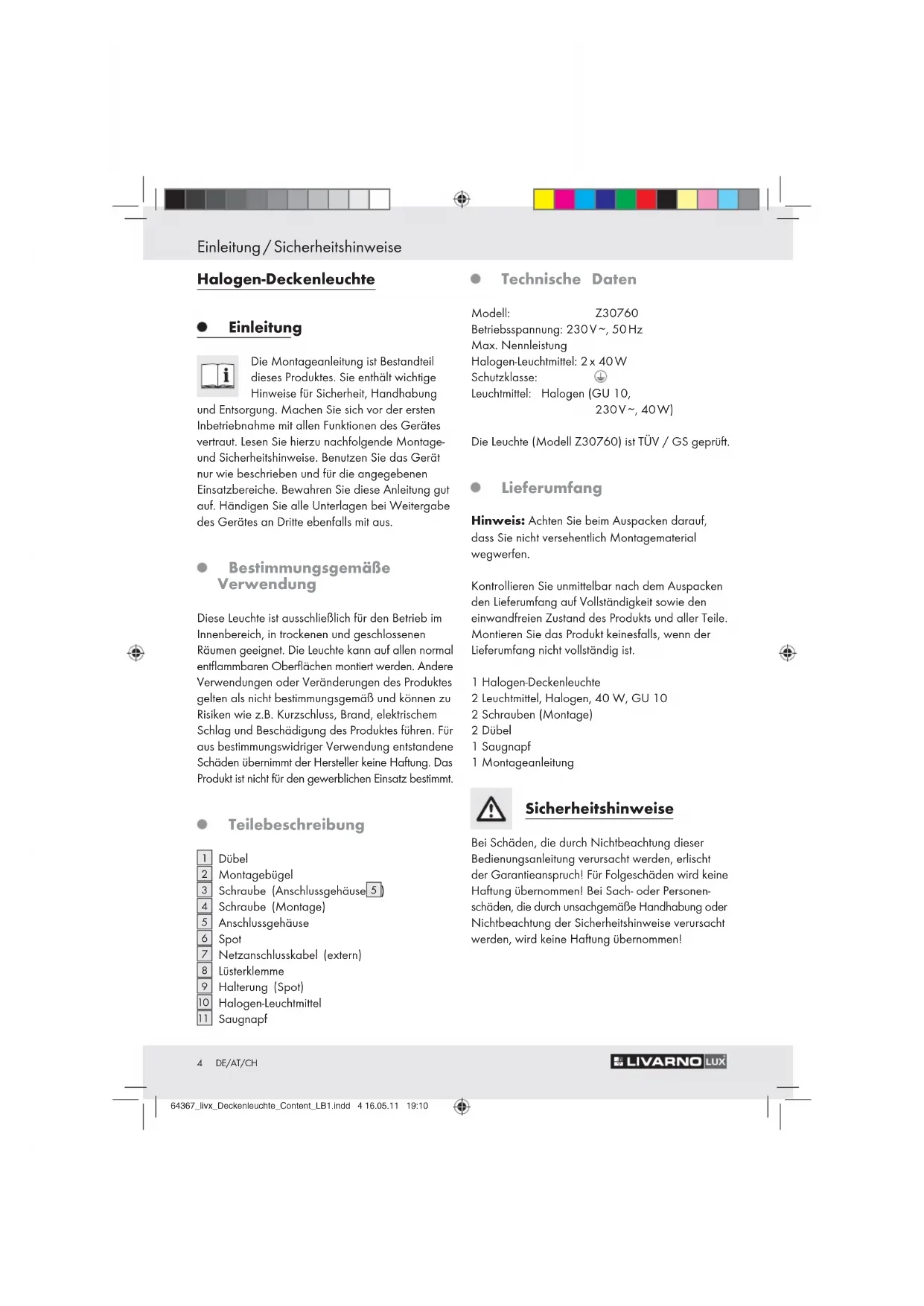 Saugnapf Technische Daten Modell: Z30760 Betriebsspannung: 230 V ∼, 50 Hz Max. Nennleistung Halogen-Leuchtmittel: 2 x 40 W Schutzklasse: Leuchtmittel: Halogen (GU 10, 230 V ∼, 40 W) Die Leuchte (Modell Z30760) ist TÜV / GS geprüft. Lieferumfang Hinweis: Achten Sie beim Auspacken darauf, dass Sie nicht versehentlich Montagematerial wegwerfen. Kontrollieren Sie unmittelbar nach dem Auspacken den Lieferumfang auf Vollständigkeit sowie den einwandfreien Zustand des Produkts und aller Teile. Montieren Sie das Produkt keinesfalls, wenn der Lieferumfang nicht vollständig ist. 1 Halogen-Deckenleuchte 2 Leuchtmittel, Halogen, 40 W, GU 10 2 Schrauben (Montage) 2 Dübel 1 Saugnapf 1 Montageanleitung Sicherheitshinweise Bei Schäden, die durch Nichtbeachtung dieser Bedienungsanleitung verursacht werden, erlischt der Garantieanspruch! Für Folgeschäden wird keine Haftung übernommen! Bei Sach- oder Personen- schäden, die durch unsachgemäße Handhabung oder Nichtbeachtung der Sicherheitshinweise verursacht werden, wird keine Haftung übernommen! 64367_livx_Deckenleuchte_Content_LB1.indd 4 16.05.11 19:105 DE/AT/CH Sicherheitshinweise LEBENS-