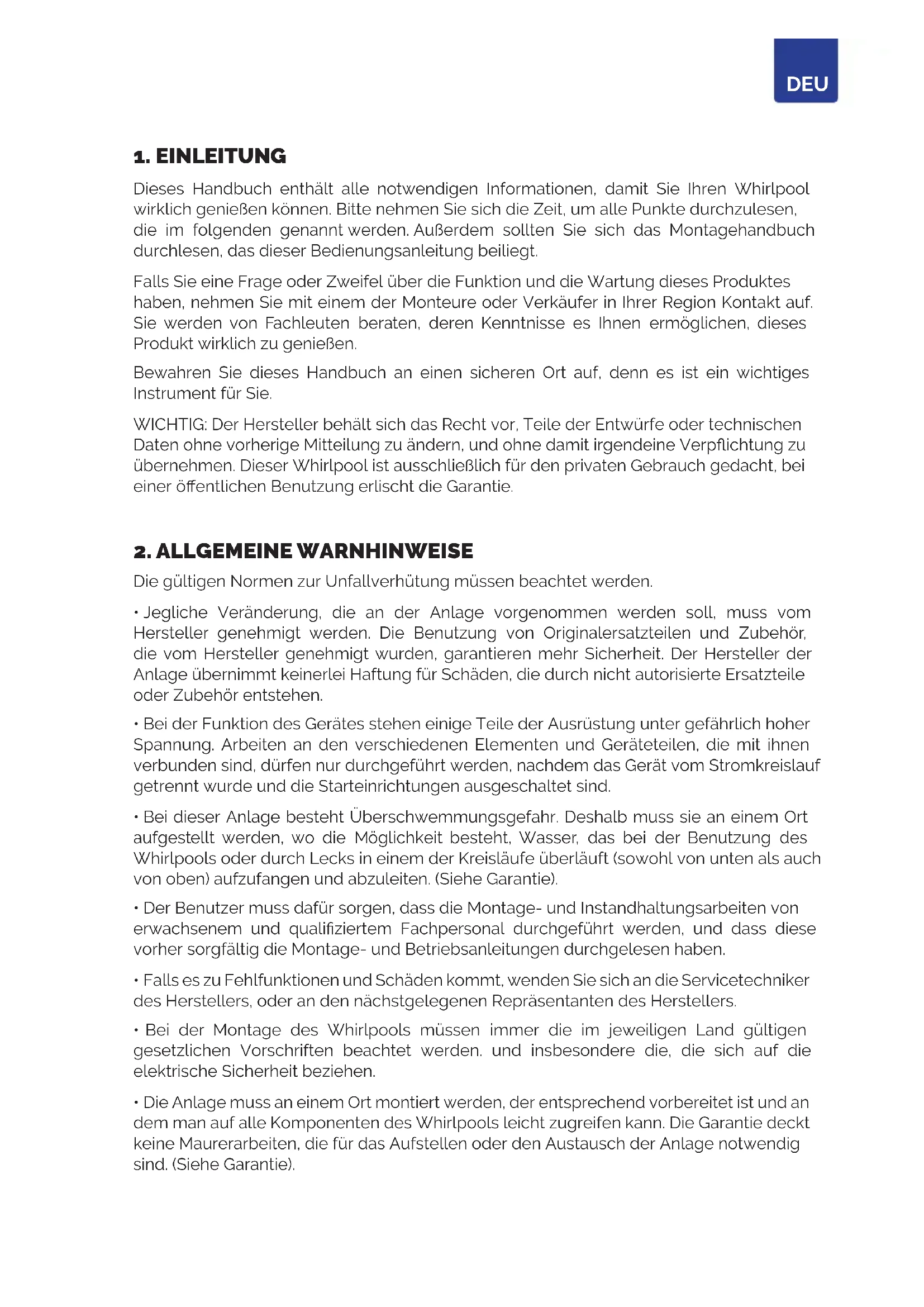Dieses Handbuch enthält alle notwendigen Informationen, damit Sie Ihren Whirlpool wirklich genießen können. Bitte nehmen Sie sich die Zeit, um alle Punkte durchzulesen, die im folgenden genannt werden. Außerdem sollten Sie sich das Montagehandbuch durchlesen, das dieser Bedienungsanleitung beiliegt. Falls Sie eine Frage oder Zweifel über die Funktion und die Wartung dieses Produktes haben, nehmen Sie mit einem der Monteure oder Verkäufer in Ihrer Region Kontakt auf. Sie werden von Fachleuten beraten, deren Kenntnisse es Ihnen ermöglichen, dieses Produkt wirklich zu genießen. Bewahren Sie dieses Handbuch an einen sicheren Ort auf, denn es ist ein wichtiges Instrument für Sie. WICHTIG: Der Hersteller behält sich das Recht vor, Teile der Entwürfe oder technischen Daten ohne vorherige Mitteilung zu ändern, und ohne damit irgendeine Verpichtung zu übernehmen. Dieser Whirlpool ist ausschließlich für den privaten Gebrauch gedacht, bei einer öentlichen Benutzung erlischt die Garantie.