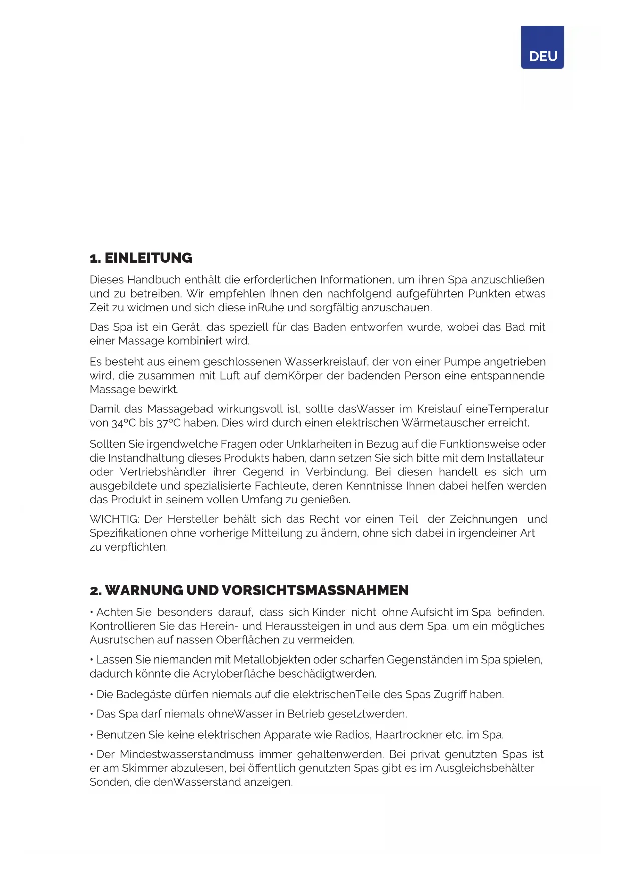 Dieses Handbuch enthält die erforderlichen Informationen, um ihren Spa anzuschließen und zu betreiben. Wir empfehlen Ihnen den nachfolgend aufgeführten Punkten etwas Zeit zu widmen und sich diese inRuhe und sorgfältig anzuschauen. Das Spa ist ein Gerät, das speziell für das Baden entworfen wurde, wobei das Bad mit einer Massage kombiniert wird. Es besteht aus einem geschlossenen Wasserkreislauf, der von einer Pumpe angetrieben wird, die zusammen mit Luft auf demKörper der badenden Person eine entspannende Massage bewirkt. Damit das Massagebad wirkungsvoll ist, sollte dasWasser im Kreislauf eineTemperatur von 34ºC bis 37ºC haben. Dies wird durch einen elektrischen Wärmetauscher erreicht. Sollten Sie irgendwelche Fragen oder Unklarheiten in Bezug auf die Funktionsweise oder die Instandhaltung dieses Produkts haben, dann setzen Sie sich bitte mit dem Installateur oder Vertriebshändler ihrer Gegend in Verbindung. Bei diesen handelt es sich um ausgebildete und spezialisierte Fachleute, deren Kenntnisse Ihnen dabei helfen werden das Produkt in seinem vollen Umfang zu genießen. WICHTIG: Der Hersteller behält sich das Recht vor einen Teil der Zeichnungen und Spezikationen ohne vorherige Mitteilung zu ändern, ohne sich dabei in irgendeiner Art zu verpichten.