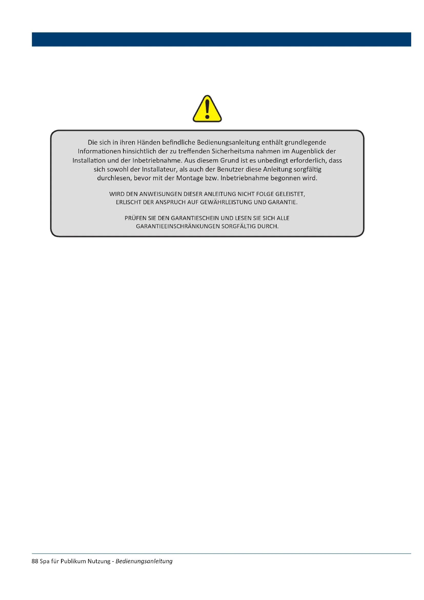 11388 Spa für Publikum Nutzung - Bedienungsanleitung Die sich in ihren Händen bendliche Bedienungsanleitung enthält grundlegende Informaonen hinsichtlich der zu treenden Sicherheitsma nahmen im Augenblick der Installaon und der Inbetriebnahme. Aus diesem Grund ist es unbedingt erforderlich, dass sich sowohl der Installateur, als auch der Benutzer diese Anleitung sorgfälg durchlesen, bevor mit der Montage bzw. Inbetriebnahme begonnen wird. WIRD DEN ANWEISUNGEN DIESER ANLEITUNG NICHT FOLGE GELEISTET, ERLISCHT DER ANSPRUCH AUF GEWÄHRLEISTUNG UND GARANTIE. PRÜFEN SIE DEN GARANTIESCHEIN UND LESEN SIE SICH ALLE