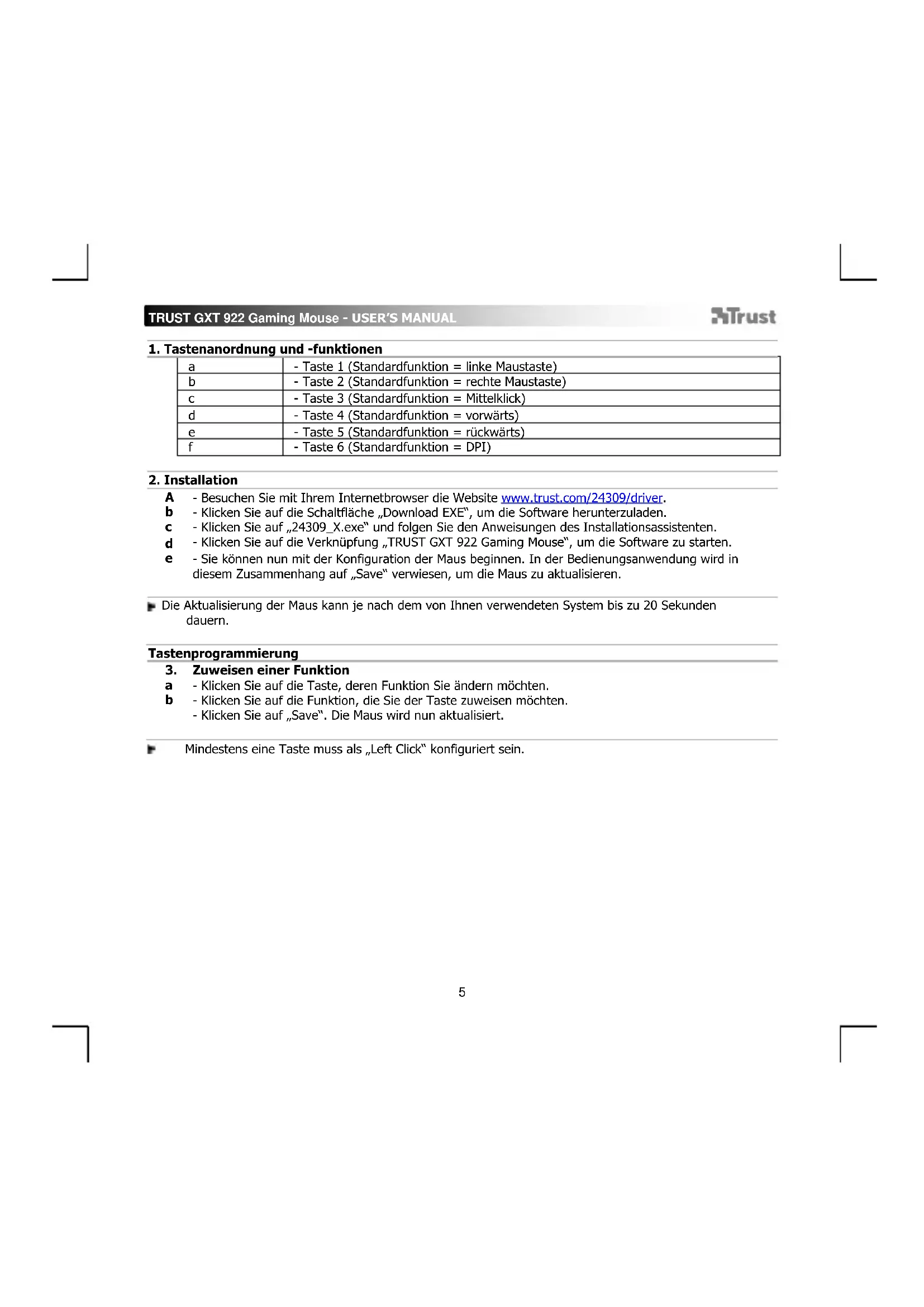 - Besuchen Sie mit Ihrem Internetbrowser die Website www.trust.com/24309/driver. - Klicken Sie auf die Schaltfläche „Download EXE“, um die Software herunterzuladen. - Klicken Sie auf „24309_X.exe“ und folgen Sie den Anweisungen des Installationsassistenten. - Klicken Sie auf die Verknüpfung „TRUST GXT 922 Gaming Mouse“, um die Software zu starten. - Sie können nun mit der Konfiguration der Maus beginnen. In der Bedienungsanwendung wird in diesem Zusammenhang auf „Save“ verwiesen, um die Maus zu aktualisieren. Die Aktualisierung der Maus kann je nach dem von Ihnen verwendeten System bis zu 20 Sekunden dauern. Tastenprogrammierung