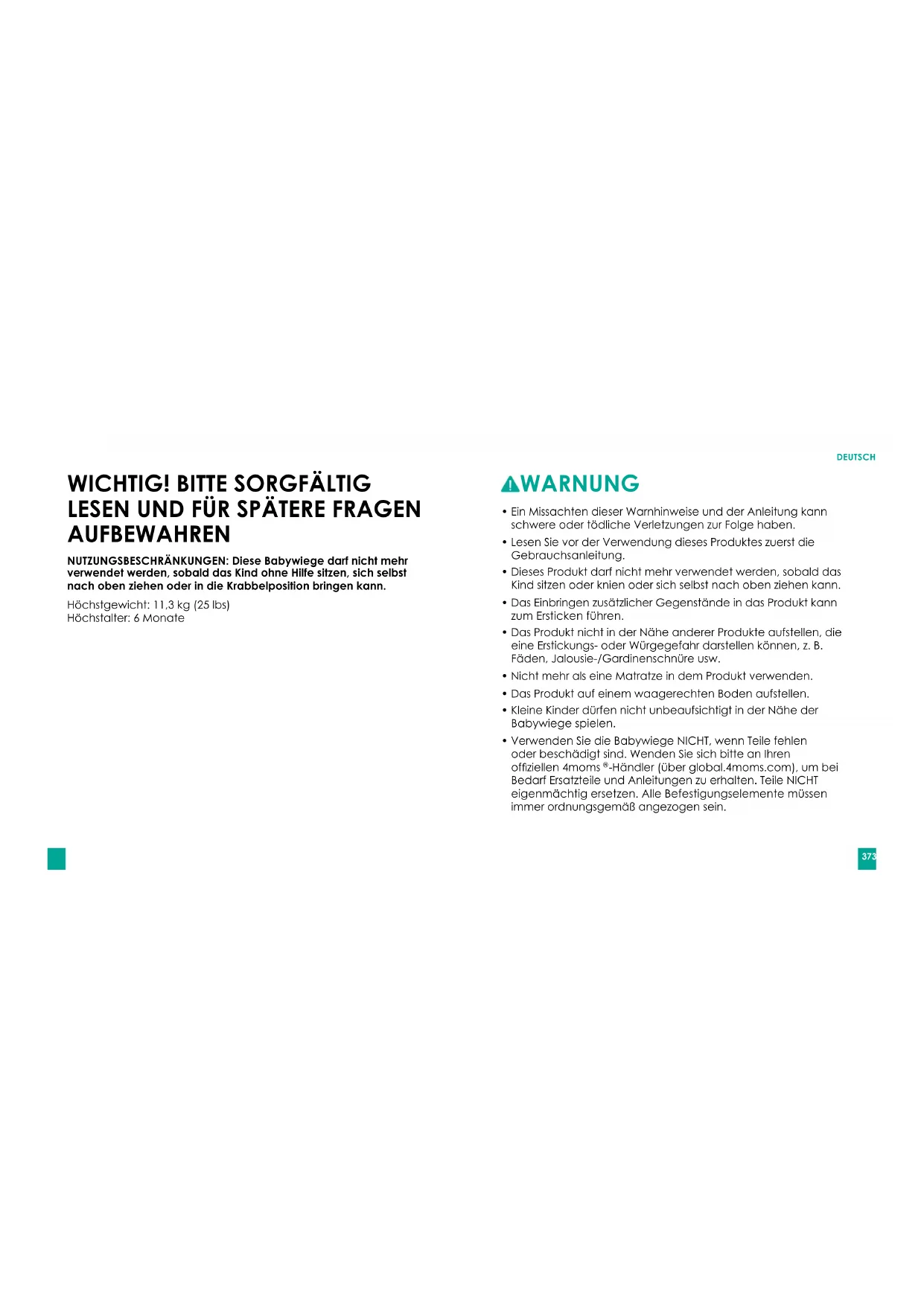 LESEN UND FÜR SPÄTERE FRAGEN AUFBEWAHREN NUTZUNGSBESCHRÄNKUNGEN: Diese Babywiege darf nicht mehr verwendet werden, sobald das Kind ohne Hilfe sitzen, sich selbst nach oben ziehen oder in die Krabbelposition bringen kann. Höchstgewicht:11,3kg(25lbs) Höchstalter: 6 Monate WARNUNG