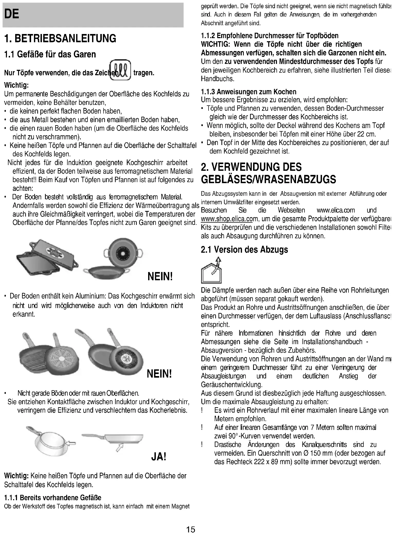 WICHTIG: Wenn die Töpfe nicht über die richtigen Abmessungen verfügen, schalten sich die Garzonen nicht ein. Um den zu verwendenden Mindestdurchmesser des Topfs für den jeweiligen Kochbereich zu erfahren, siehe illustrierten Teil dieses Handbuchs.